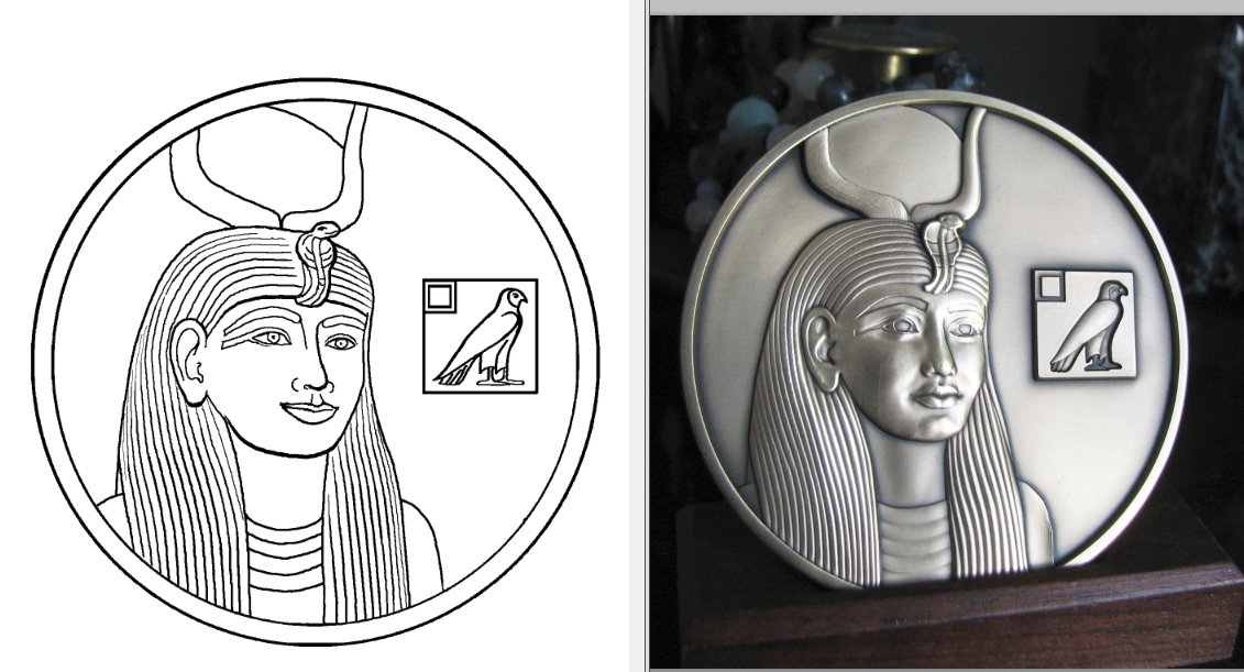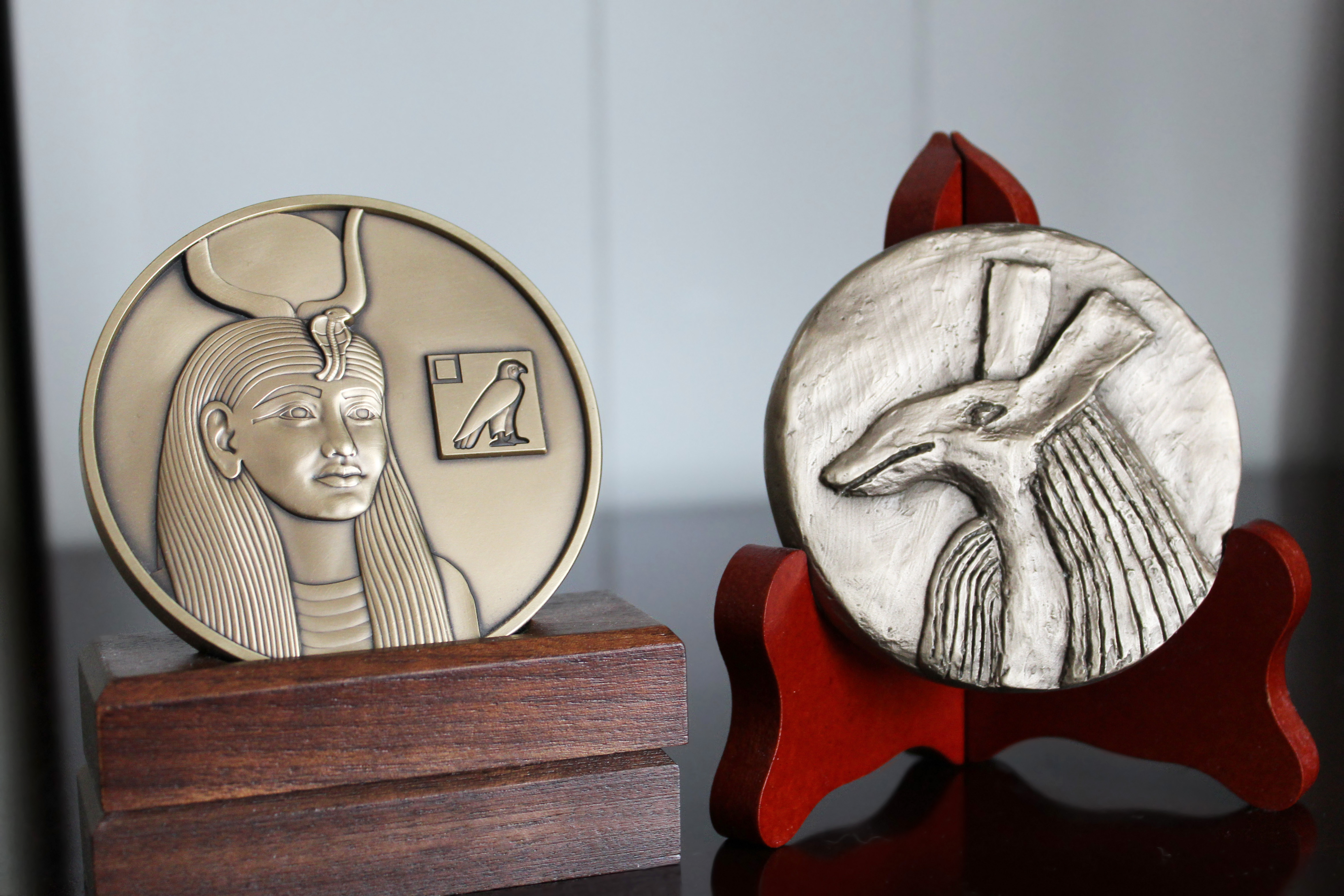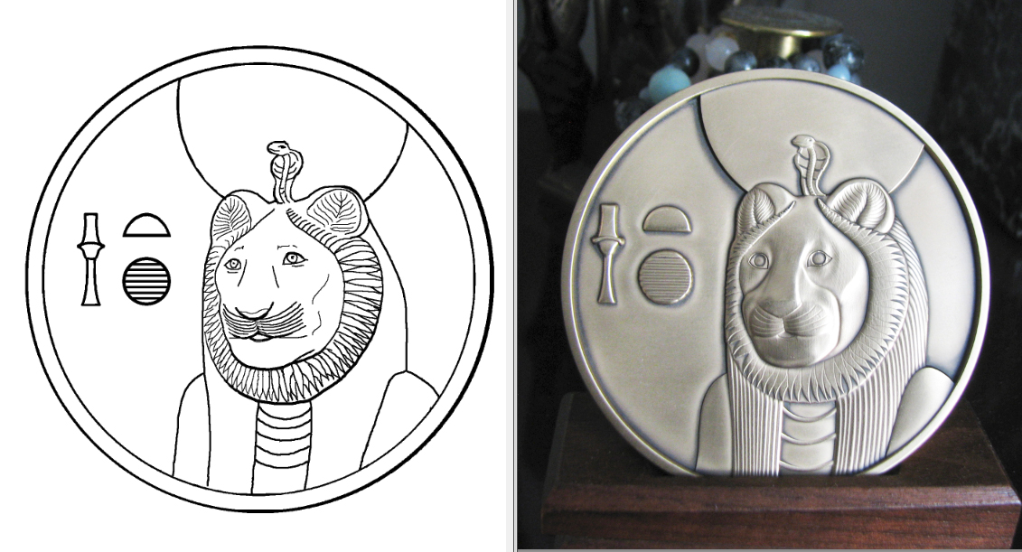 The idea for the Hathor/Sekhmet medal began during the Festival of the Beautiful Reunion in June of 2017. Inspired by Julia's gift to me of a coin featuring Anubis (Yinepu), and subsequent research into its designer and the medallions she crafted, I designed two rounds featuring Hathor and Sekhmet.