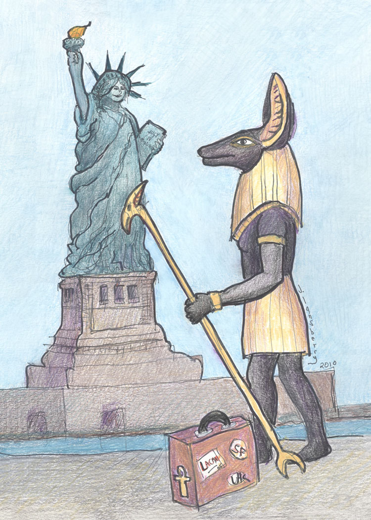 "A 25-foot tall replica statue of the Egyptian god Anubis, with a suitcase at his feet, passes in front of the Statue of Liberty while taking a tour of the New York waterways, Tuesday, March 23, 2010. The statue was traveling to announce the upcoming exhibit "Tutankhamun and the Golden Age of the Pharaohs" starting on April 23 at the Discovery Times Square Exposition." (AP via abcnews.com)