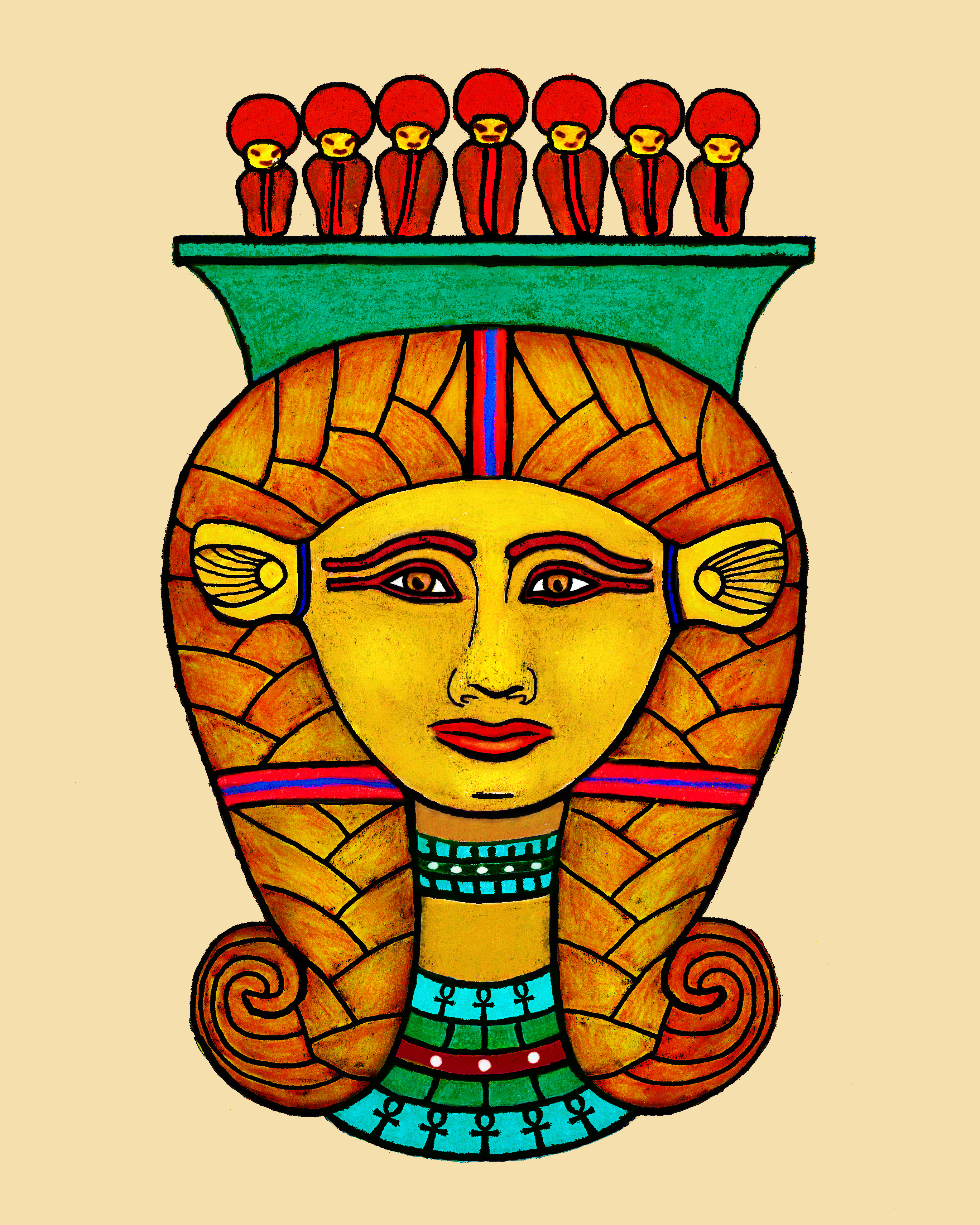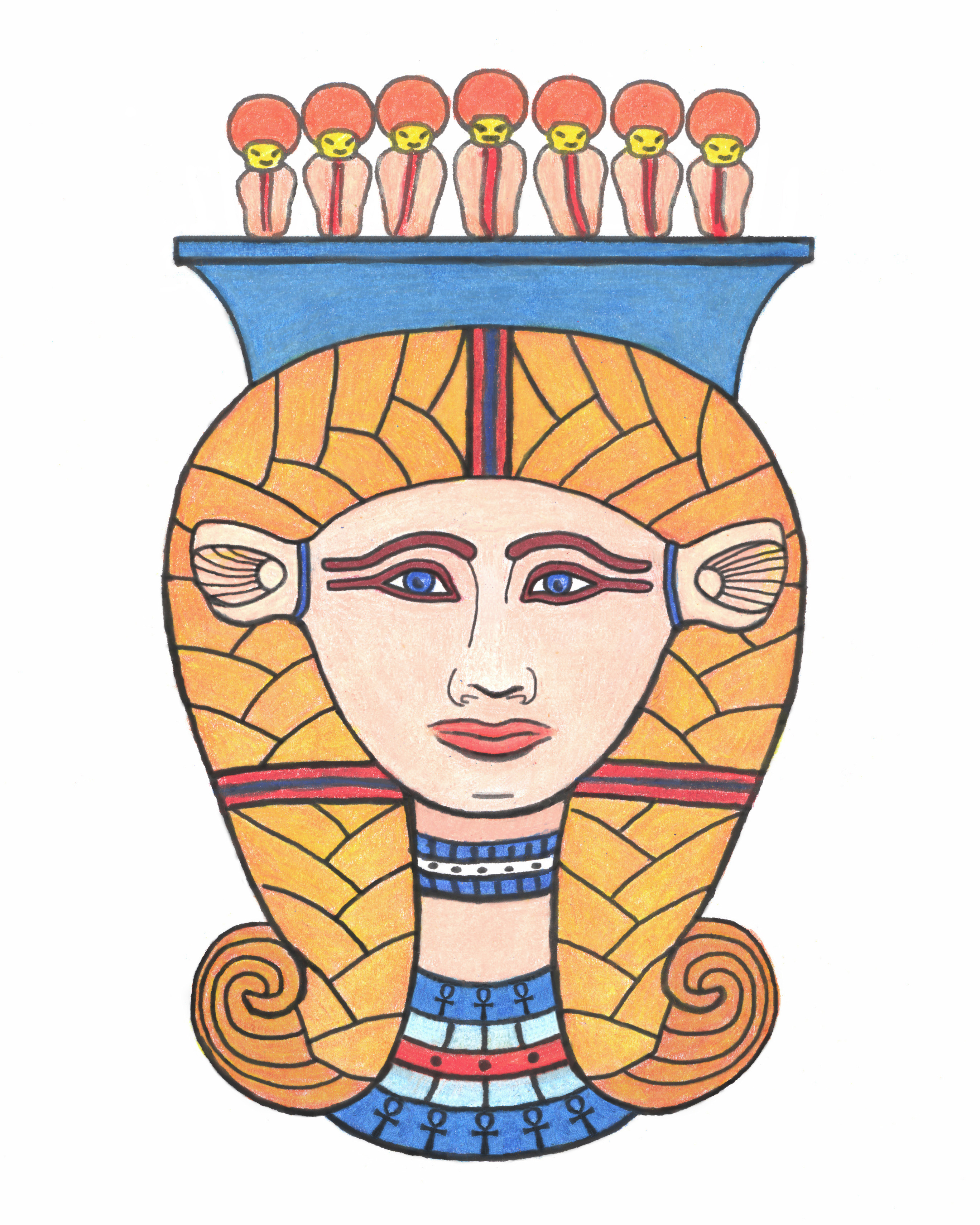 ![]() Arjunalistened's photo was most consulted as it is directly head on and has good detail. The capital at the Nicholson museum might not have had a row of uraei, the break is a very clean one. But the other three show seven uraei from the front view and the Louvre example shows five uraei from the side view, along with a papyrus scepter at the center and two crowned uraei on each side of the scepter, such that these two show from the front view. I opted not to include these side uraei in my trace. It's uncertain if the capital at the Nicholson museum had them originally. The curving side lines probably represent the curved lines in the sistrum as in Nebnefer's block. I kept the little hints of sistrum curve in this art piece. I evened up some of the original's irregularities, and hand drew some further decoration. That hand drawing had to be digitally fixed, too. From this version, I was able to print, when I then colored. Later I digitally fixed her eyes and mouth to have more of a smiling appearance. As I was working to refine this further, Julia reminded me that the upside down ankhs might have unpleasant symbolism. So I made them all upright in the colored version.