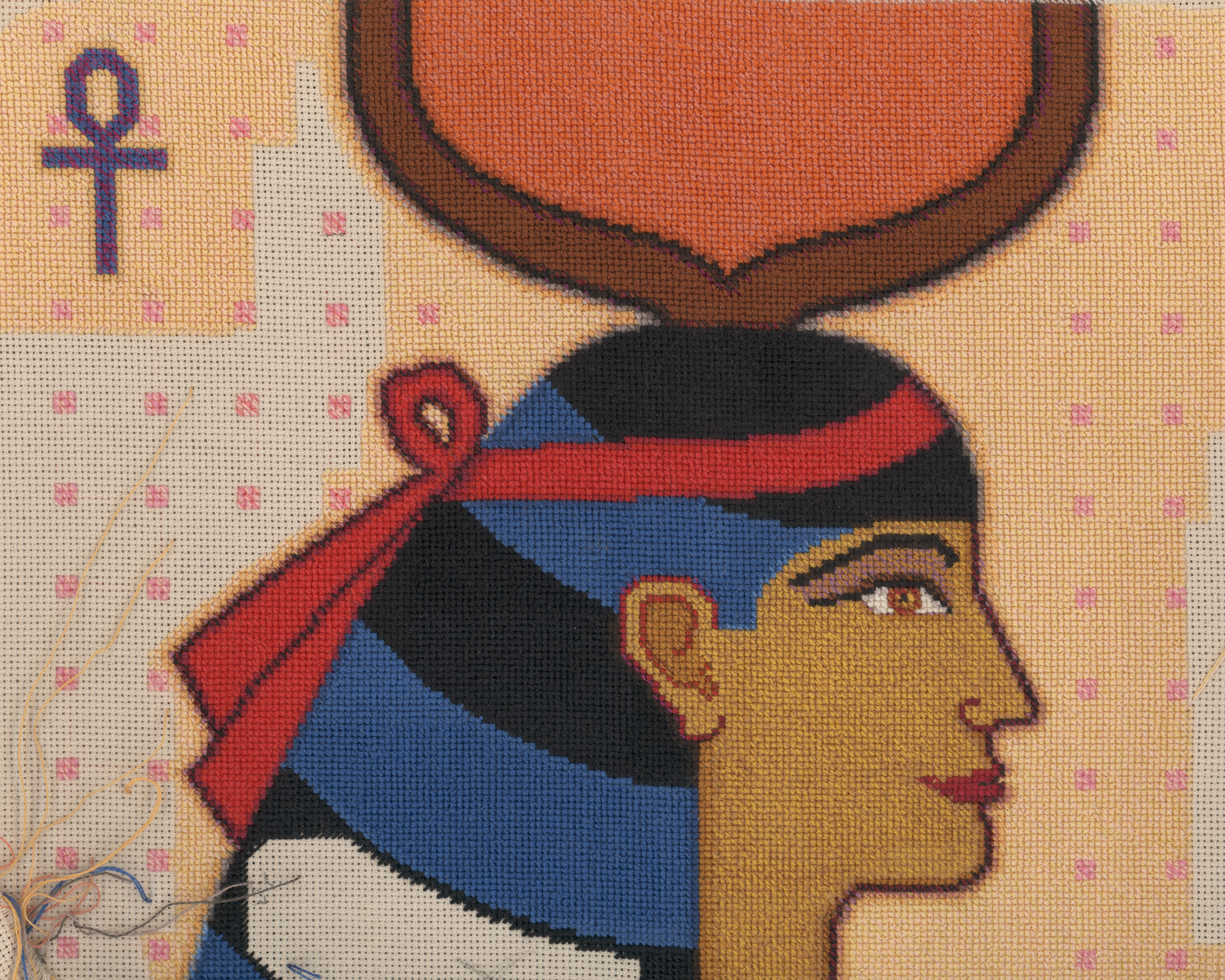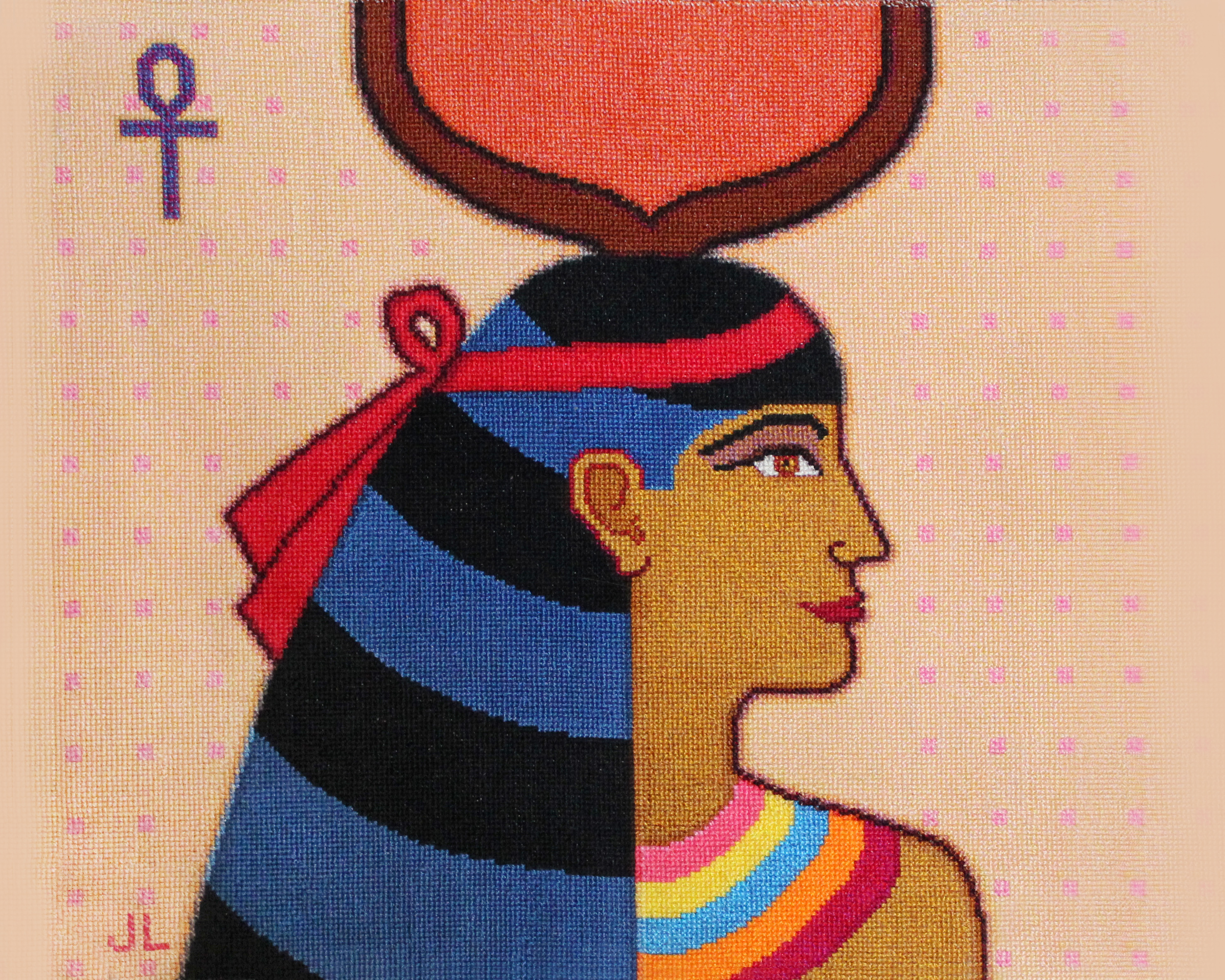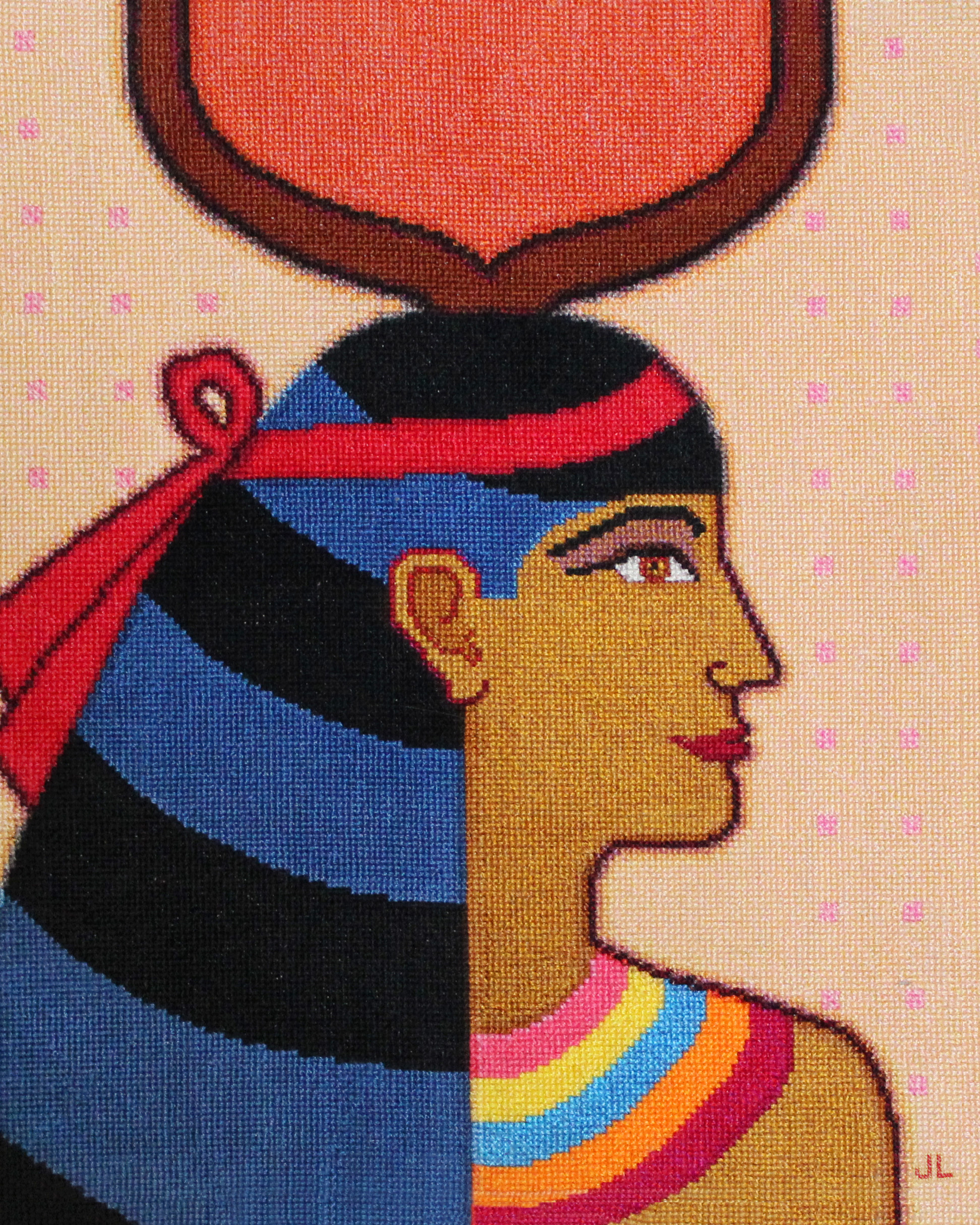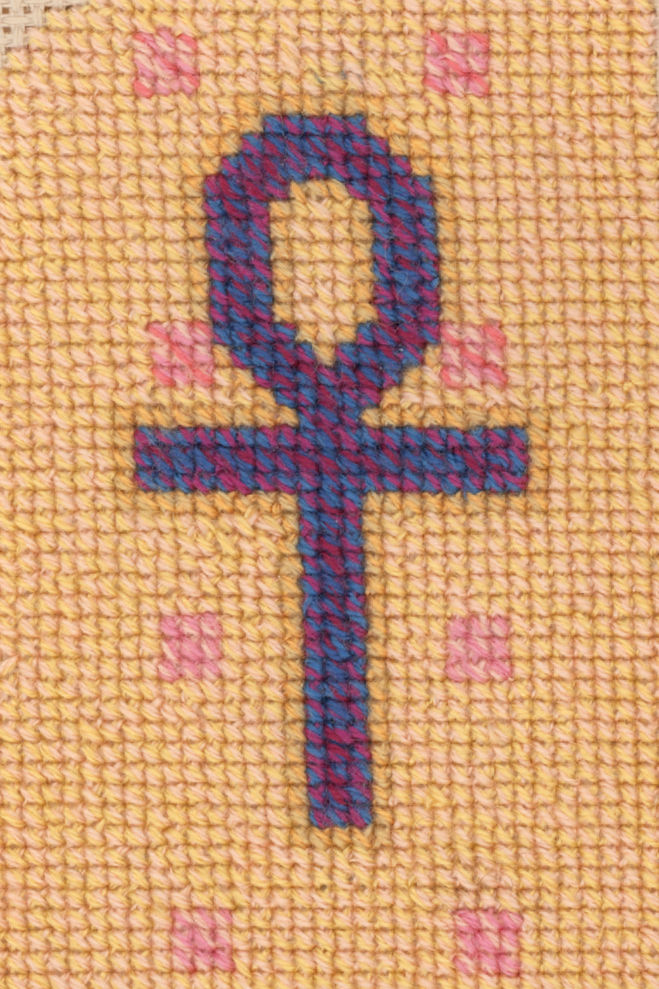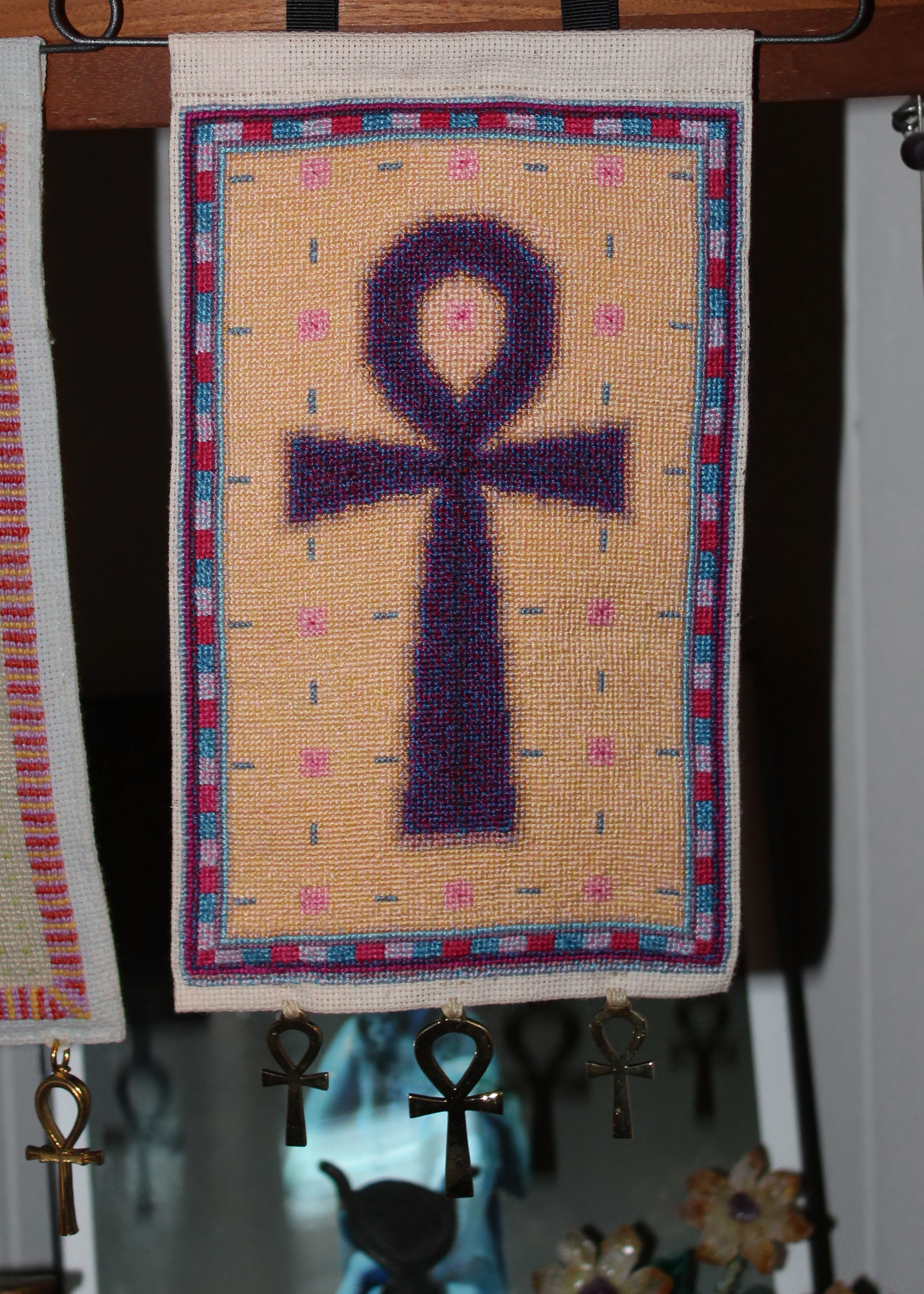 I like these colors so much, I pondered doing a larger ankh, similar to ones I've done earlier. Would I have enough of the light peach (no.20) and yellow (no.676) of the background? The ankh itself is (outer: blue (no.3765) and magenta (no.917)) and inner: dark blue (no.312) and dark magenta (no.915). The pips (which in that case I would hope look like flowers) are two shades of pink (nos. 204 and 603)