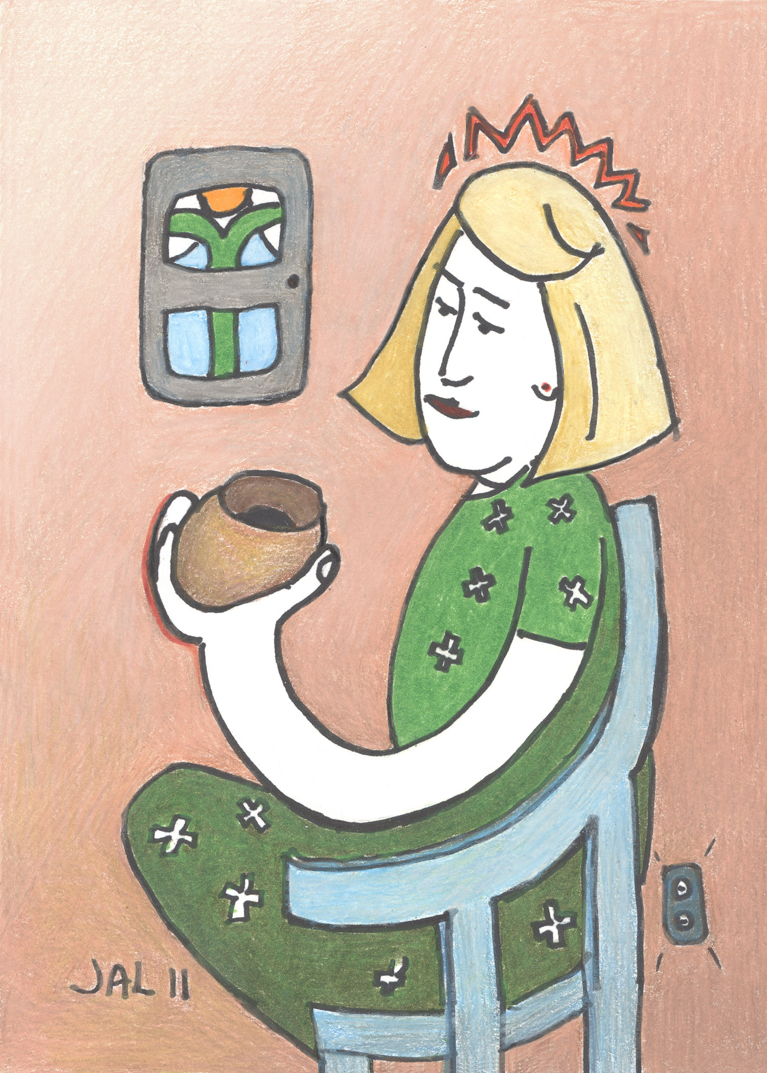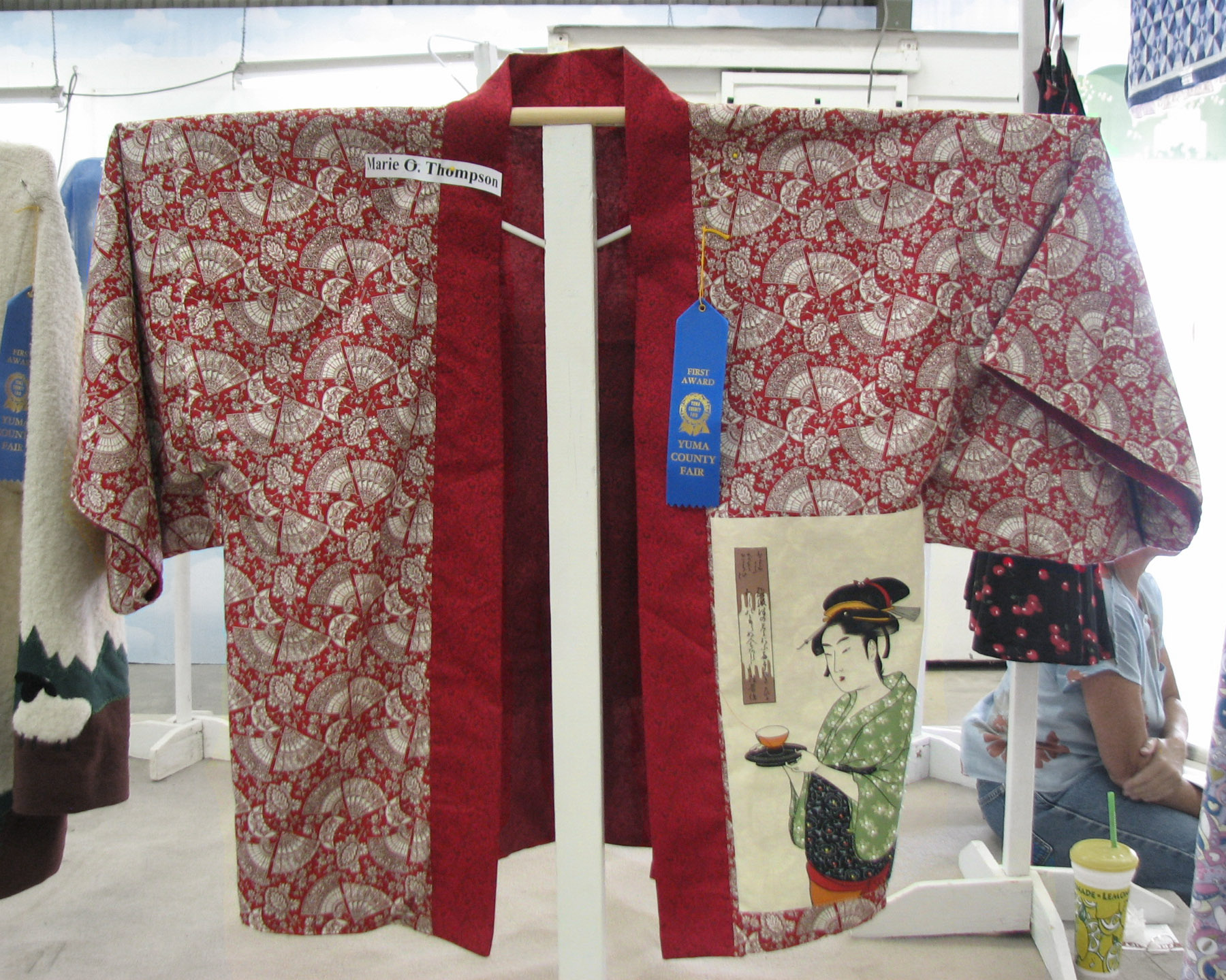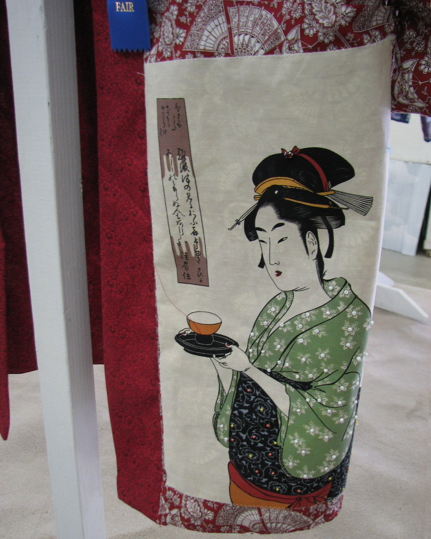 Although this piece is an intuitive piece, my intuitive mind must have remembered Japanese prints of ladies with cups of tea as I drew and colored it. The scene is so frequent, it even shows up in fabric. One of this year's creative Yuma County Fair contributors made a kimono using such fabric:![]() Detail of the lady with her tea cup (By Marie O. Thompson) Artwork and photo © Joan Ann Lansberry, March/April 2011 |