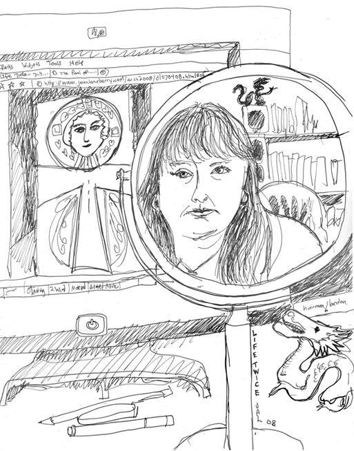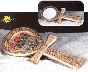I decided on a self portrait. I plopped the mirror before me and smiled to see the scene behind it of the Coptic ankh. I remembered ANKH, the Egyptian word for "life" is also their word for "mirror". The artisans often made word pun of this, making mirrors ankh shaped. For instance, a gilded mirror shaped thusly was found in Tutankhamun's tomb.
