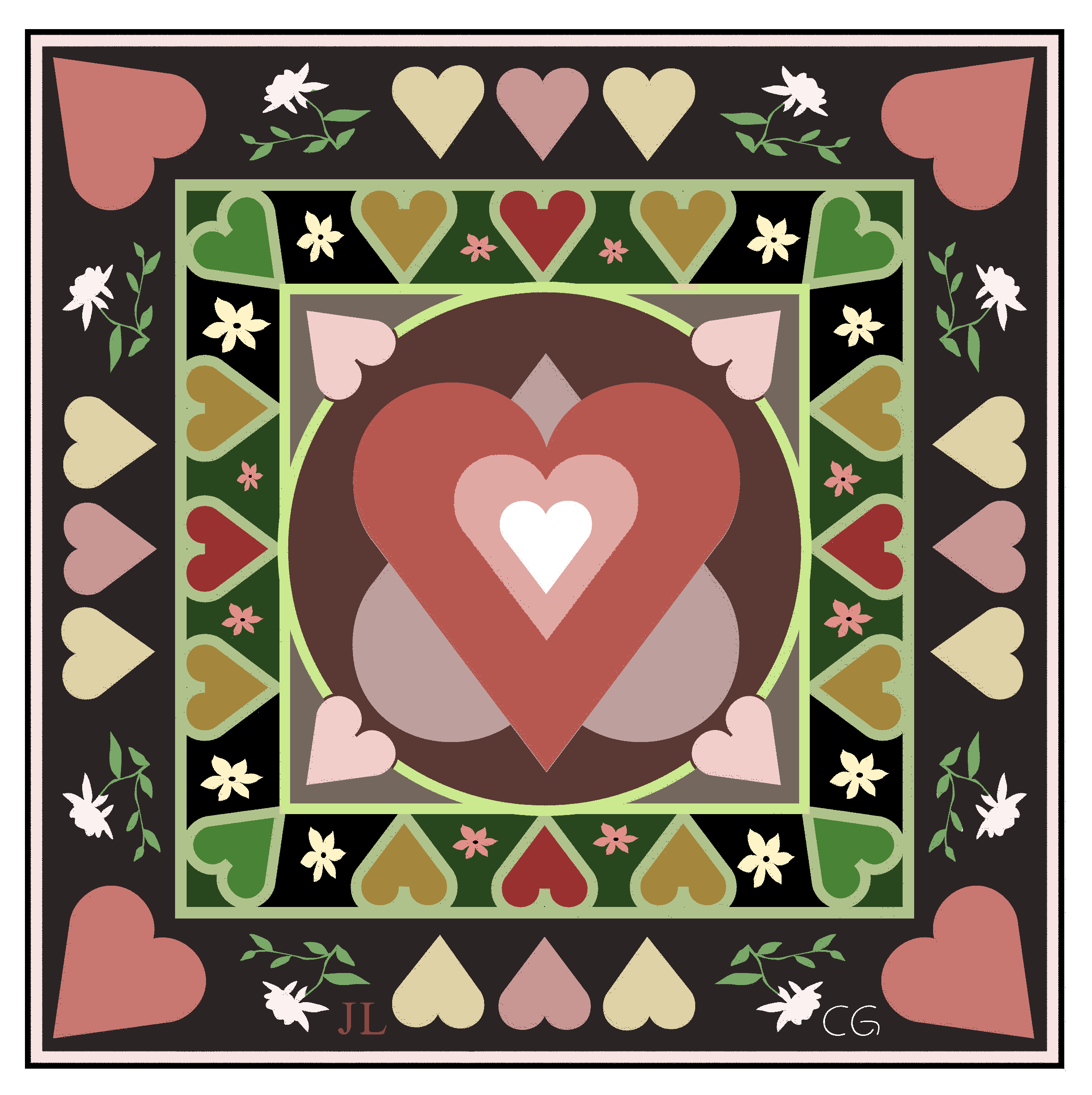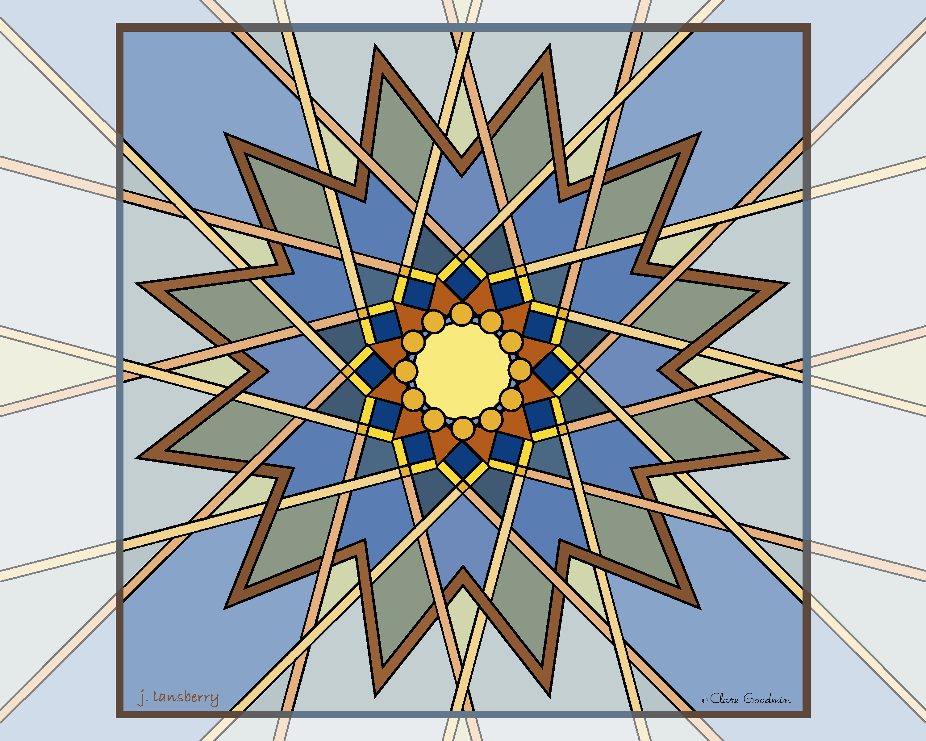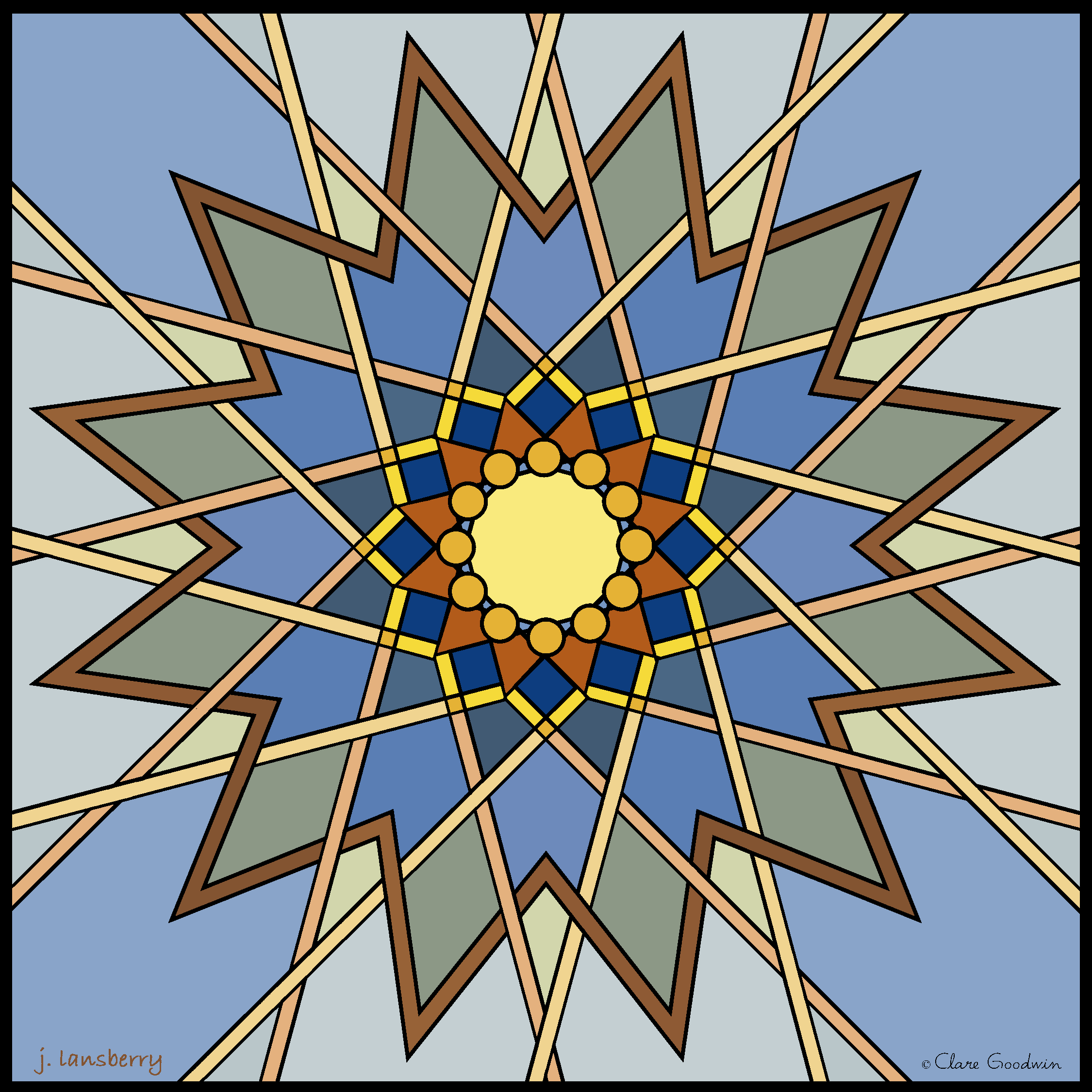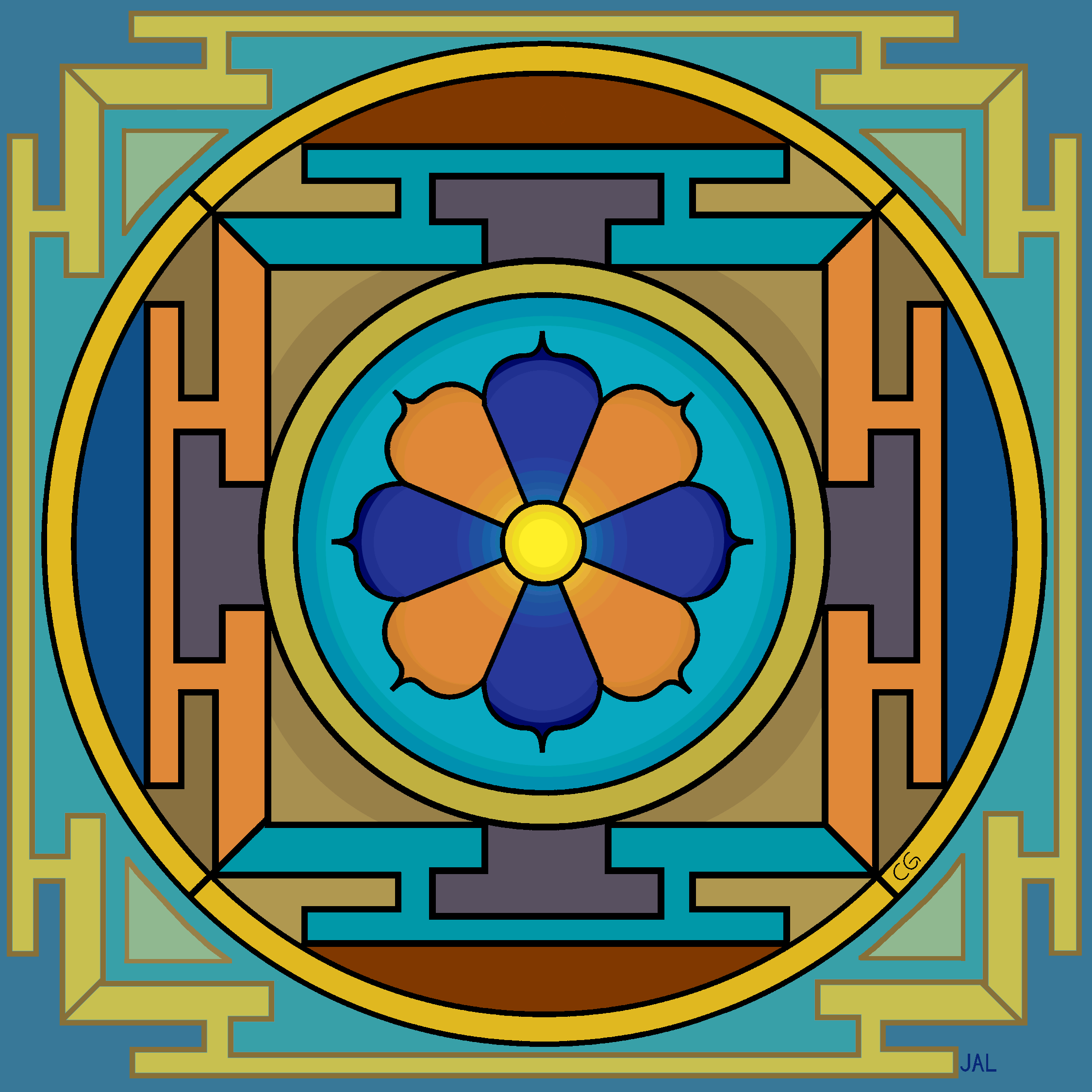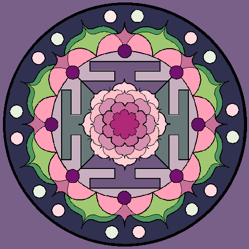 | I was again inspired by the Mandala of the Month. The square version done, all black lines by Clare Goodwin, all coloring mine, I decided to make a version suitable for print and framing. Either way, by printing via your printer or using a photo site for 8x10, this should result in a version ultimately framable in 8x10: |