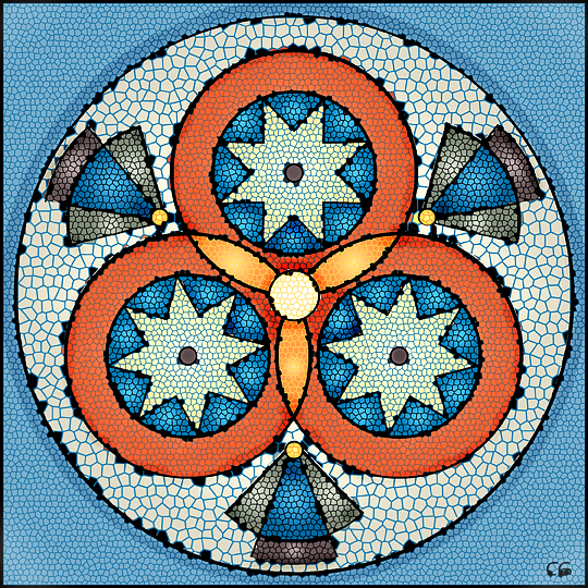 design. Julia, who is _SO_ knowledgable about things, noticed right away the Islamic influence of the original linear mandala. I think this came from the person who this month has the mandala site of the month. Paul Barchilon is a Sephardic Jew who creates art in the Islamic style. He explains about the Islamic "prohibition to include any kind of representational artwork. The complexity of design they have achieved within those limitations in 1300 years of art has always amazed me, both by how different it is from Western art, and at how incredibly sophisticated it is." A weird synchronicity, I found a link elsewhere to more artwork created within this very restrictive limitation