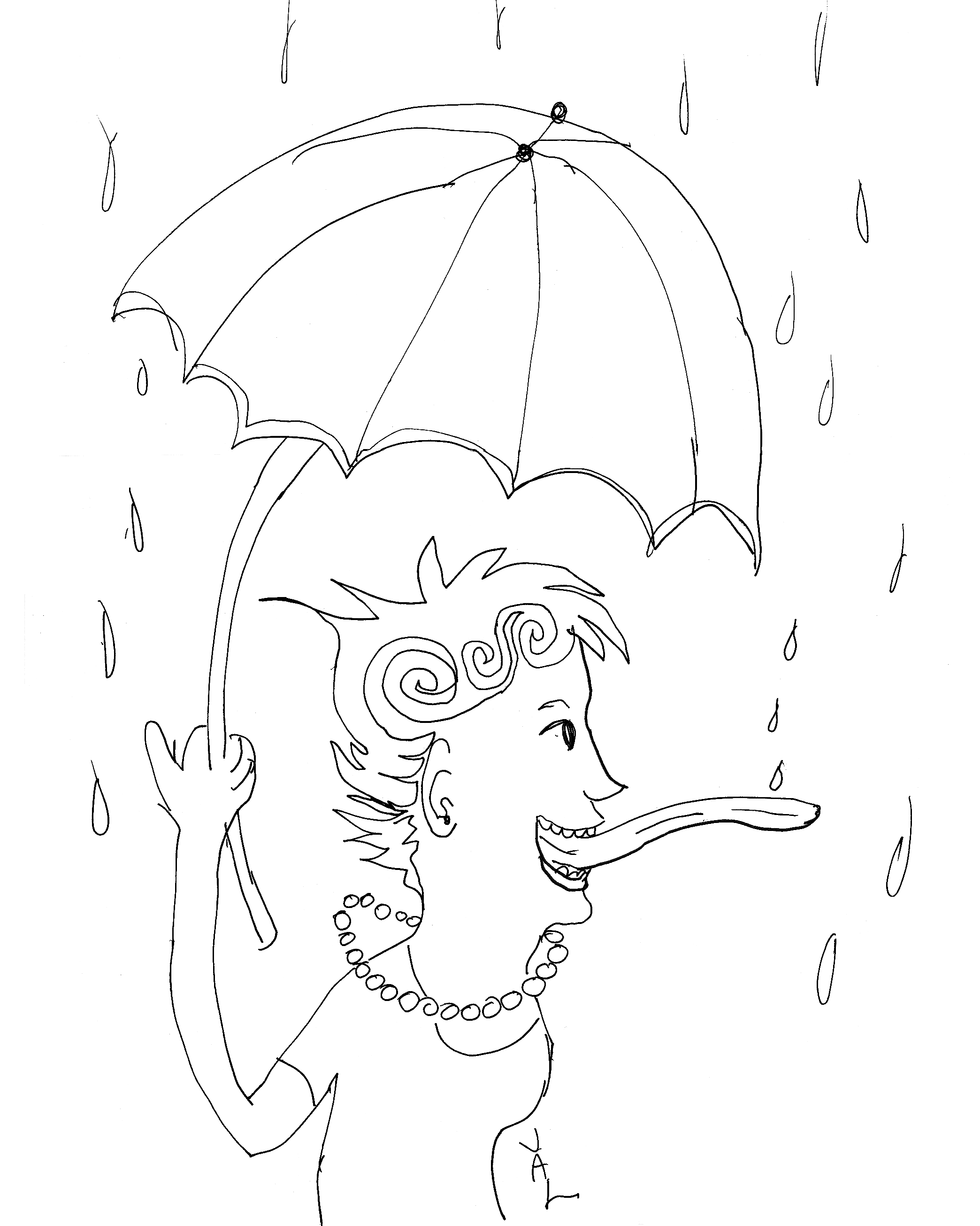 | While looking at some illos for the "Illustration Friday theme of 'rain', an image flashed in my mind's eye of a huge long tongue sticking itself outside of a rain shelter and catching raindrops. So I used that cheap thin 'marker' paper, and let go with the 'auto' style. I ran out of room and had to tape another sheet to the first. In the scanning, I removed all evidence of that. I like the playful feel it has. |