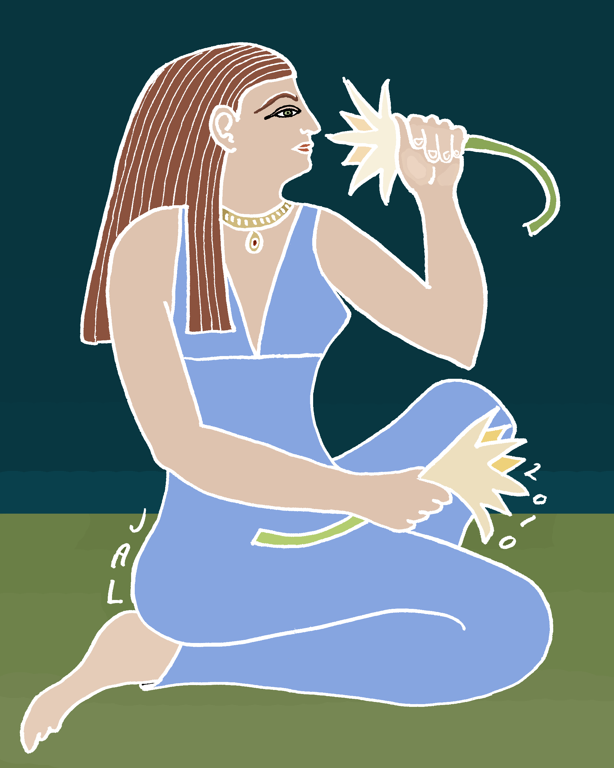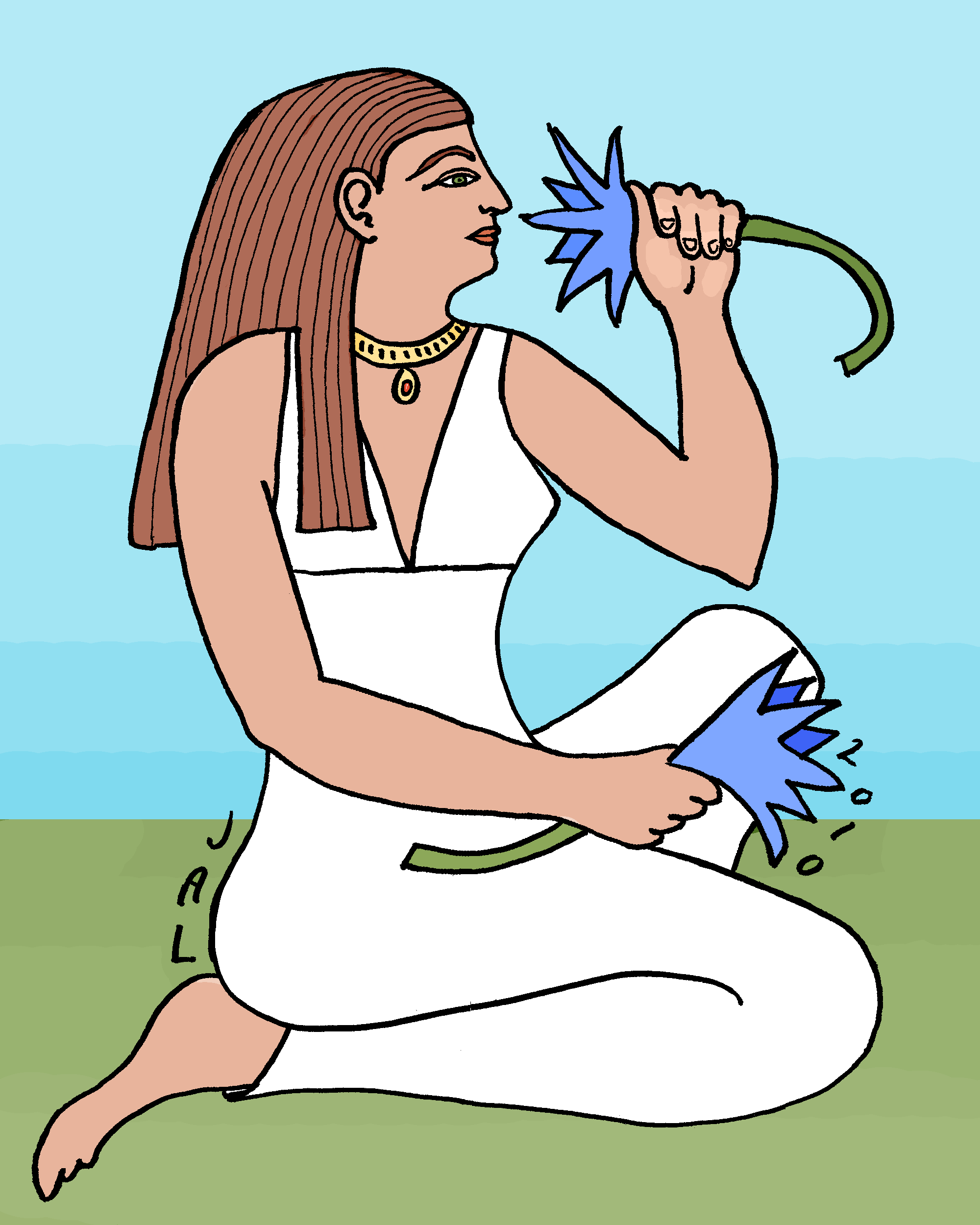 This is based on a 4th Dynasty 'lotus' sniffer at the Metropolitan Museum. I took Niankhwadjet's torso and combined it with Isis' leg pose. To give her right arm something graceful to do, I gave her another lotus to hold and possibly offer. The information accompanying the relief says the scent of a lotus is associated with rebirth because the flower opens each morning for the sun. Bridget McDermott in Decoding Egyptian Hieroglyphs informs us further: "The lotus had an important symbolic role in religious life. The blue lotus, which opens with the first rays of the sun, and the white lotus, which opens only at night, were associated with the sun and moon, and the opposing forces of light and dark...The lotus became a symbol of rebirth after death" and is "also linked to fertility and was a sexual symbol." But as I recall reading in the KMT magazine, 'lotus' is really a misnomer, the flower is really a water lily. Geri Harrington confirms this recollection, "The Egyptian lotus (Nymphaea lotus) is actually a water lily and looks different from the Chinese or sacred lotus (Nelumbo nucifera).", (_Growing Chinese Vegetables in Your Own Backyard_, page 162). And here is a beautiful "lotus" from the Third Intermediate Period, which I photographed at the Met Museum: |