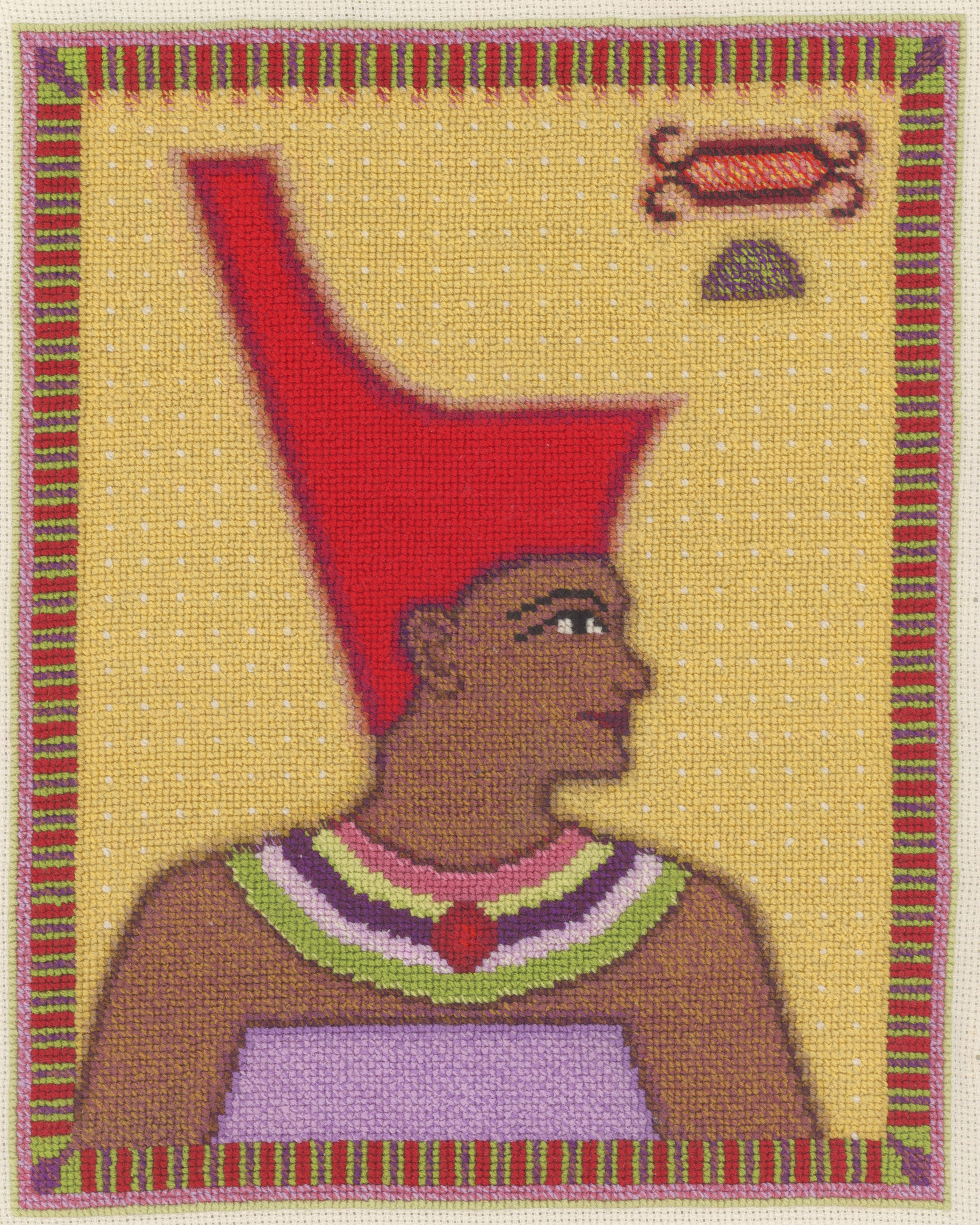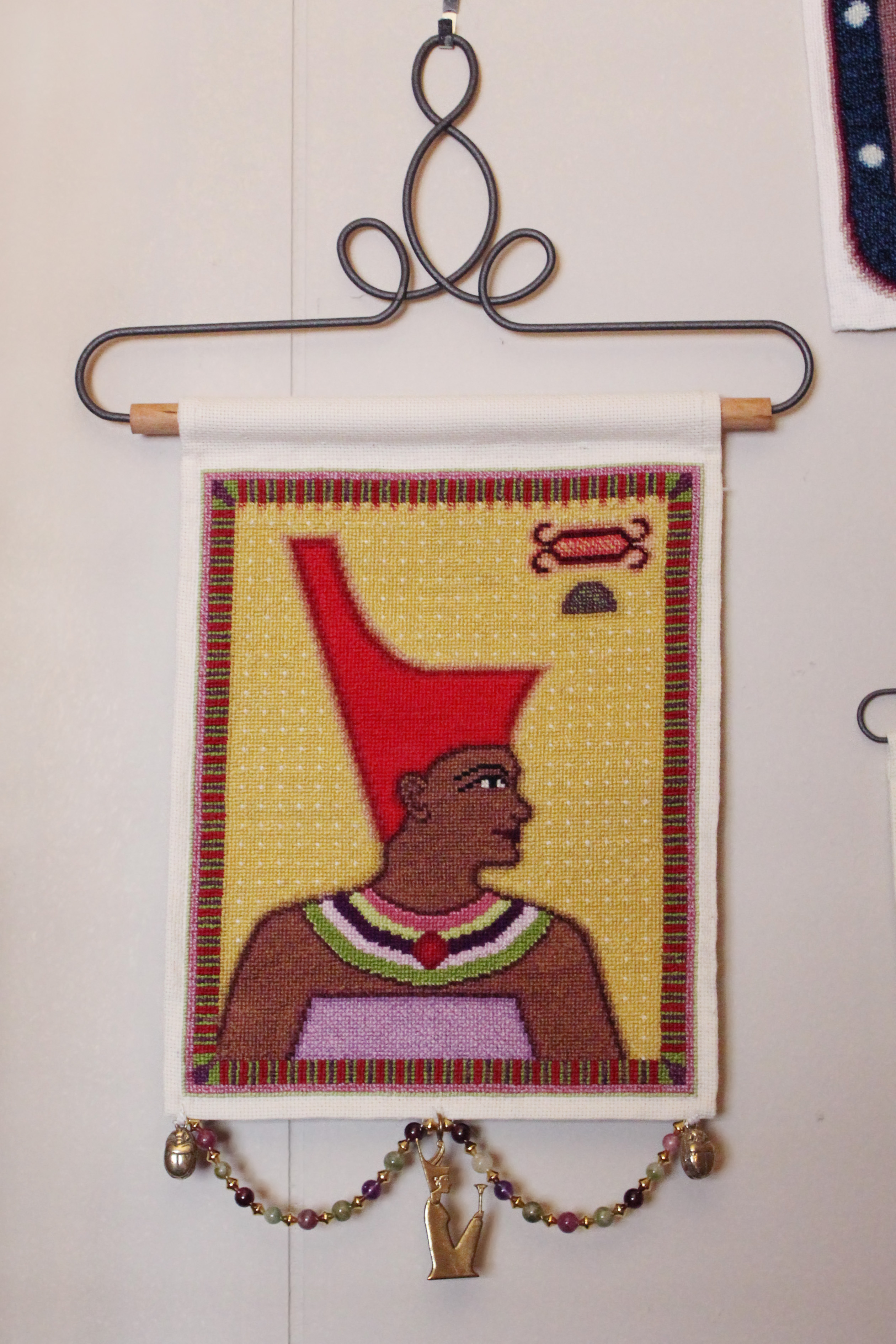 I took some inspiration from the way I did Nebthet's tapestry, using the tiny 'pips' and a similar border.
