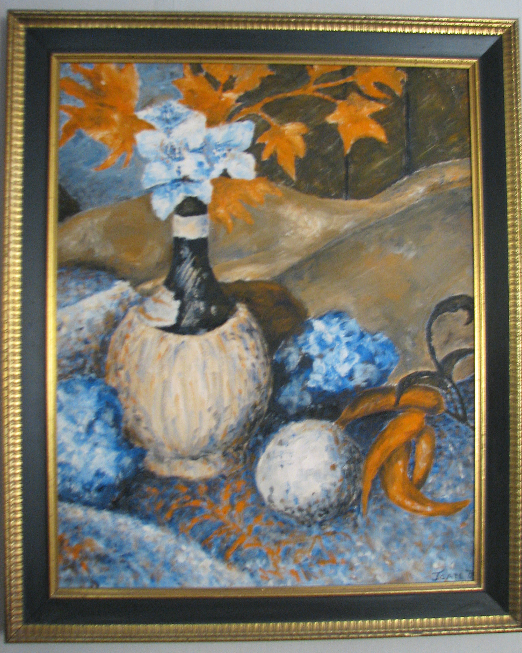 This is one of the very first oil paintings I did. It was done with just three colors, ultramarine blue, orange and white. I found I could make this limited palette appear much more varied than just the three original colors by blending them.