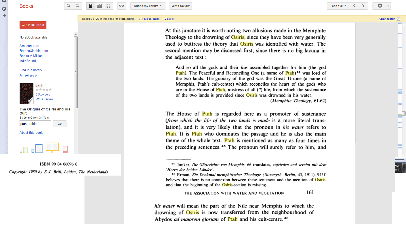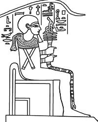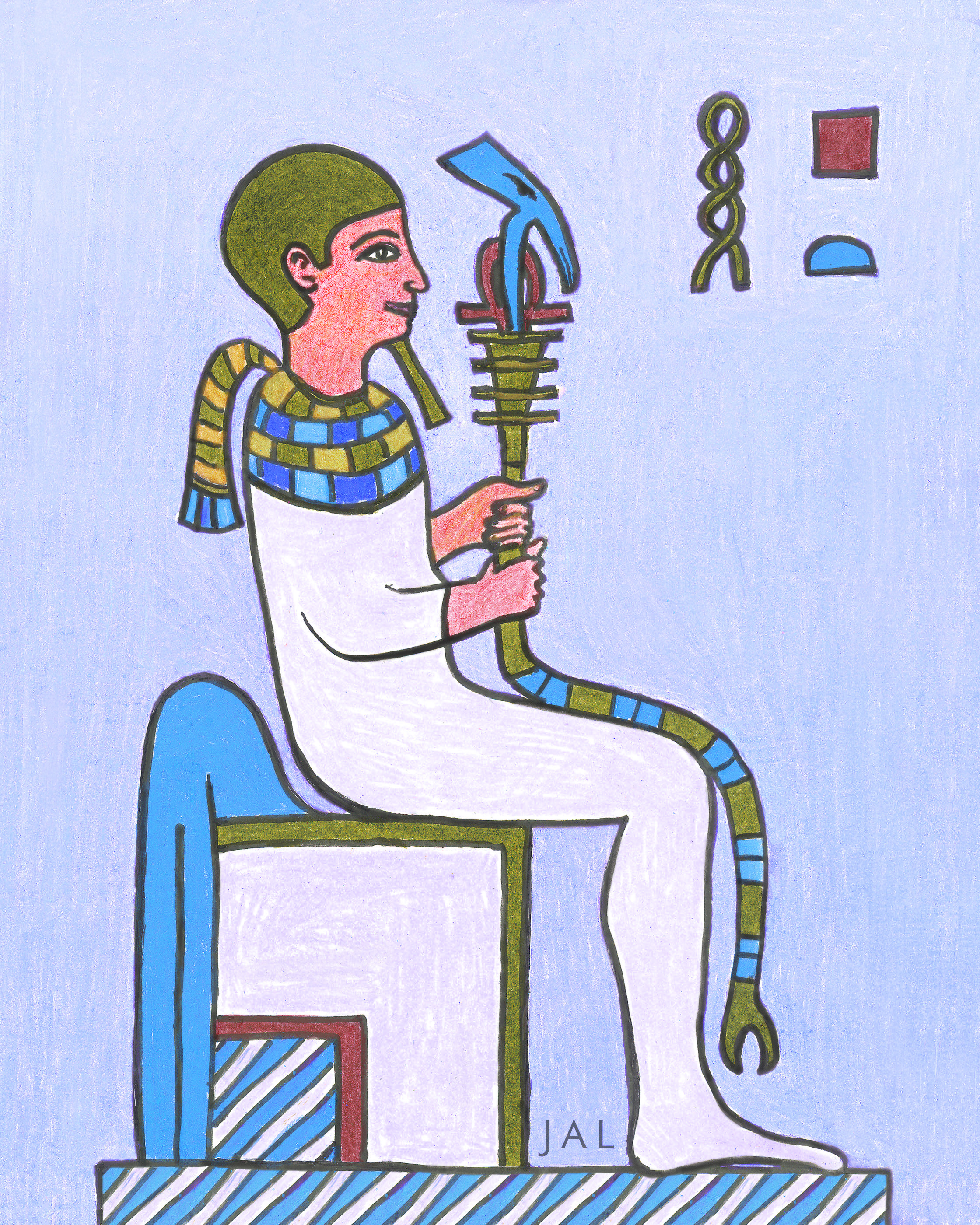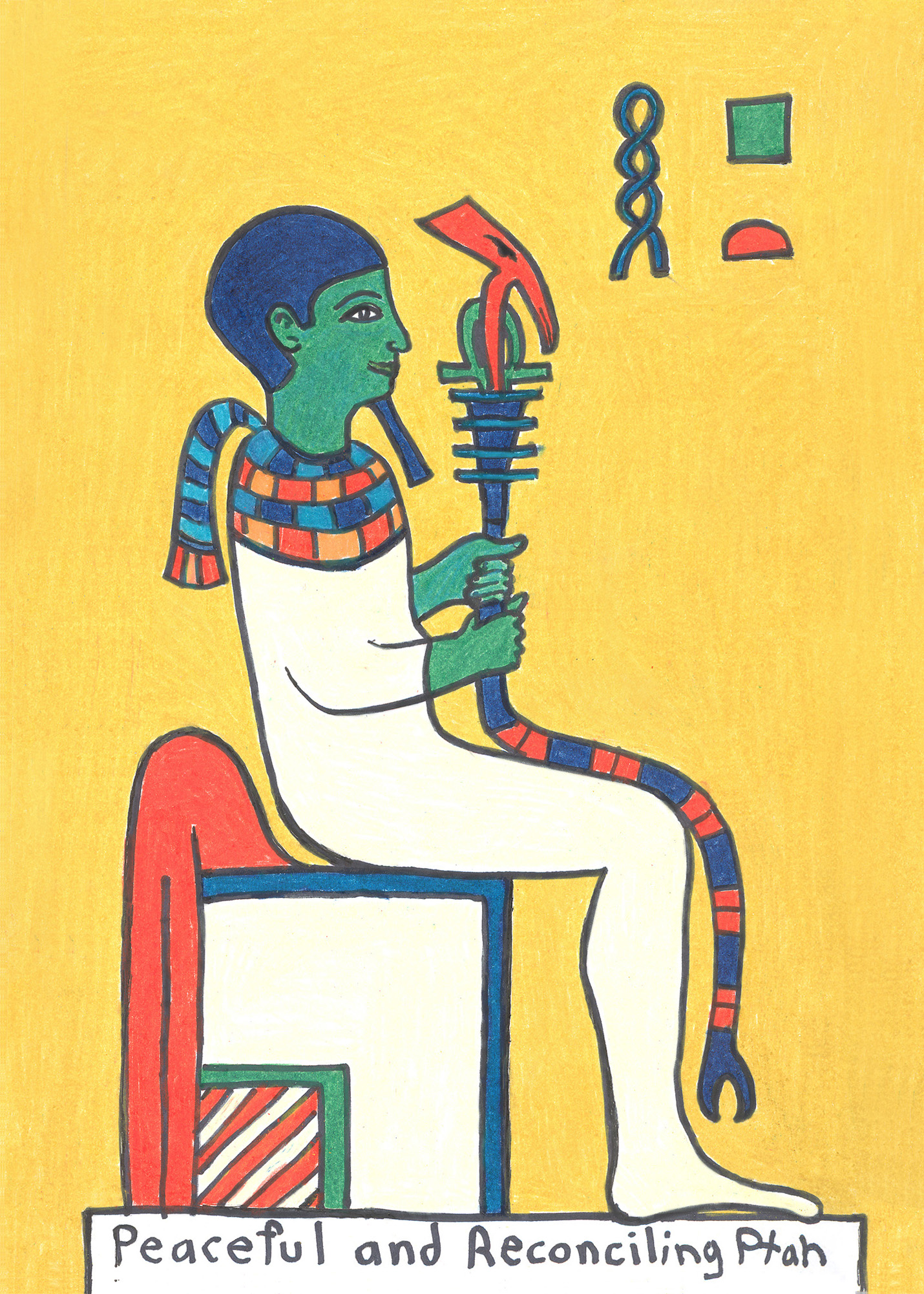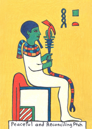 I took many influences for this. The chief one is the line drawing I did of a detail from the stela of Penbuwy. But I also consulted a photo from Horemhab's tomb (by William Petty), and other photos. As with Thoth, Ptah also has a Reconciling Reputation. "Horus and Seth 'were reconciled and united...their quarreling ceased...being joined in the House of Ptah...'" (from the Shabako Stone, quoted by Simson Najovits in "Egypt, Trunk of the Tree", (Algora Publishing, 2003), page 191) "And so all the gods and their kas assembled together for him (the god Ptah). The Peaceful and Reconciling One (a name of Ptah) was lord of the two lands." (Memphite Theology as quoted by John Gwyn Griffiths in The Origins of Osiris and His Cult, (Brill, 1980), page 160) I had an epiphany about the name of Ptah: