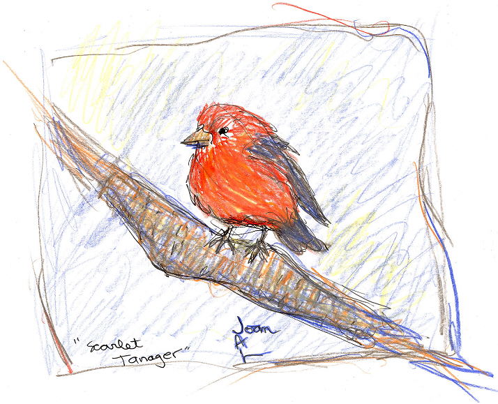 I did a little search on tanagers. Wikipedia informs me that "Only 4 species are migratory, using North America as their breeding grounds. They are the Scarlet Tanager, Western Tanager, Hepatic Tanager and the Summer Tanager." So my scarlet tanager drawing fits the celebration of the day!