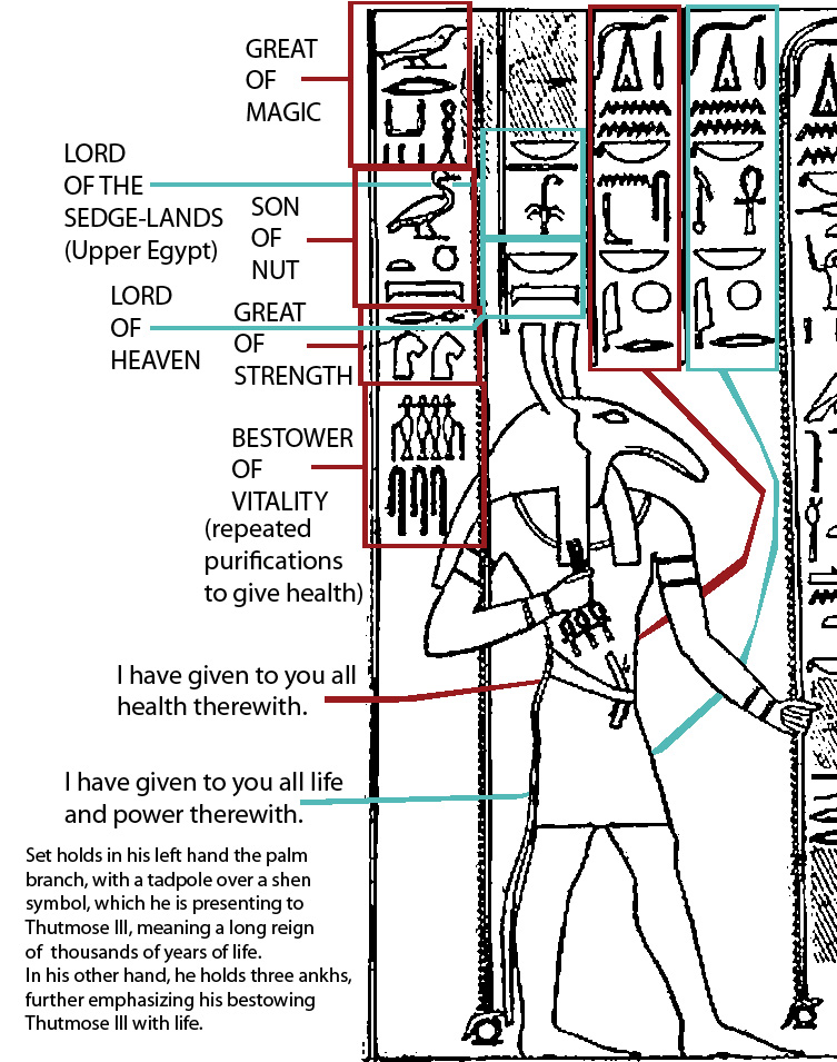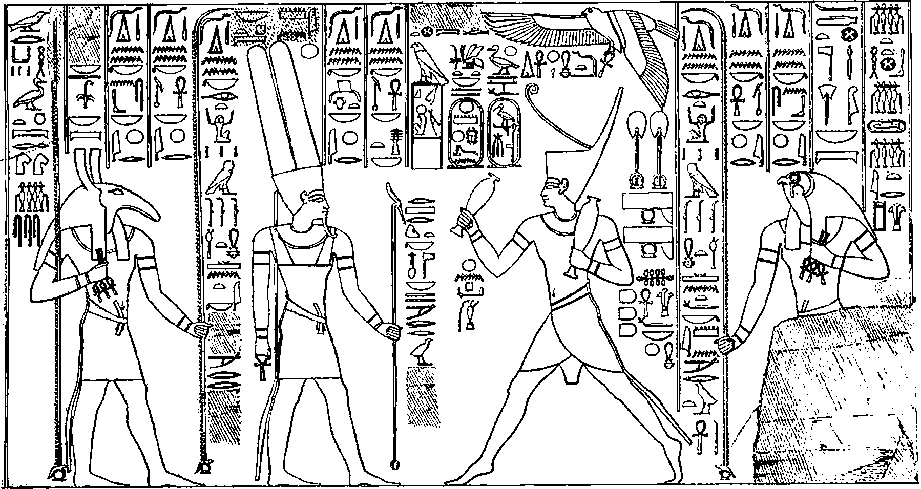 This piece was originally created by reference to both a photo and a drawing of Thutmose III's Heb Seb scene at Karnak. Between the recent photo, (by Arja Kontkanen), with all the damage that occurred since Lepsius' drawing and his more complete scene, I could come to some idea of what the scene looked like when new. In Lepsius' drawing, Thutmose III is running, while carrying two heset jars. He has passed by Horus, who holds three ankhs and holds a palm branch. He approaches Amun, Set is behind Amun. Set also has palm branches. The presentation of palm branches ensures a long reign. Set has his titles: ‘Son of Nut’, ‘Lord of the sedge lands’, ‘Lord of heaven’ and 'great of magic'. |