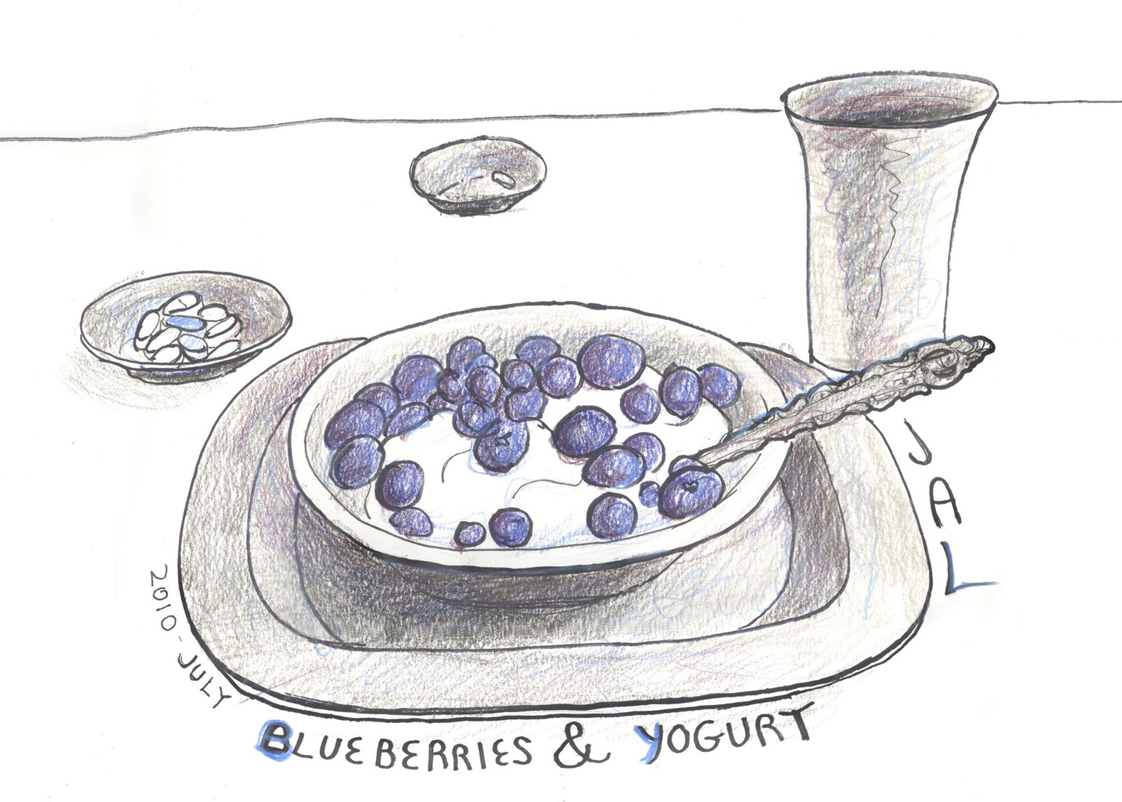 This was the breakfast that almost wasn't. Was it the terrible heat making me woozy? Last Thursday night, I dropped the container with the blueberries all over the floor. I managed to salvage a