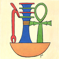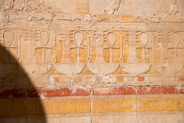 In Kairoinfo4u's photo, we can see cow feet at the top. Is this the wall on which Hatshepsut is being suckled? "Chris and Steve" have a photo set on Flickr which shows the band of was/djed/ankhs in larger context. Hatshepsut, whose image was scratched out in later times, is seated on a throne, with her hand extended to Hathor, who is licking her hand. |