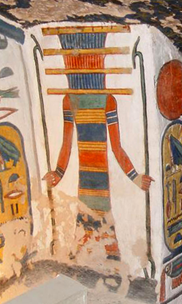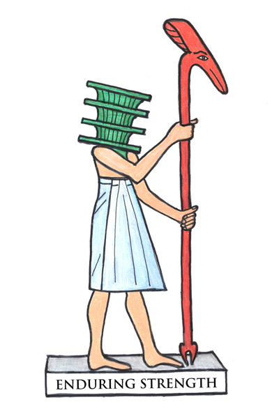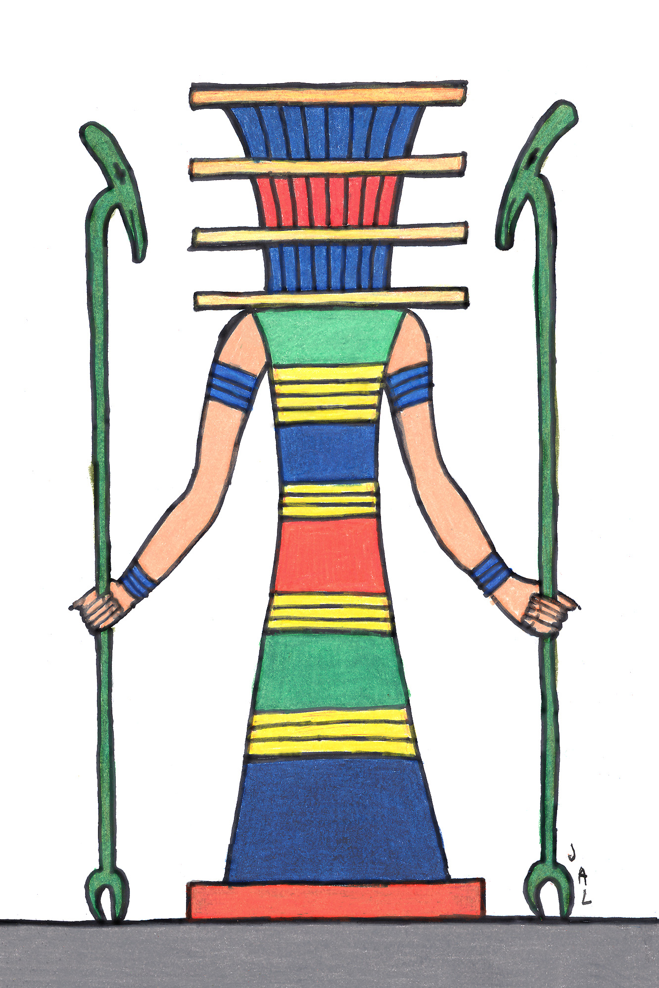 When I did my first personified Djed holding a Was scepter, I didn't know whether any ancient Djed had ever grasped a Was scepter. However, I now know they have, and Nefertari's tomb has a beautiful example of one. (Really, Nefertari's tomb has beautiful examples of EVERY symbol and Deity!) I took my model, which was a crop of a 2005 SCA photo Marcel Maessen shared online, and photoshopped it a bit to overcome the irregularities of perspective:
