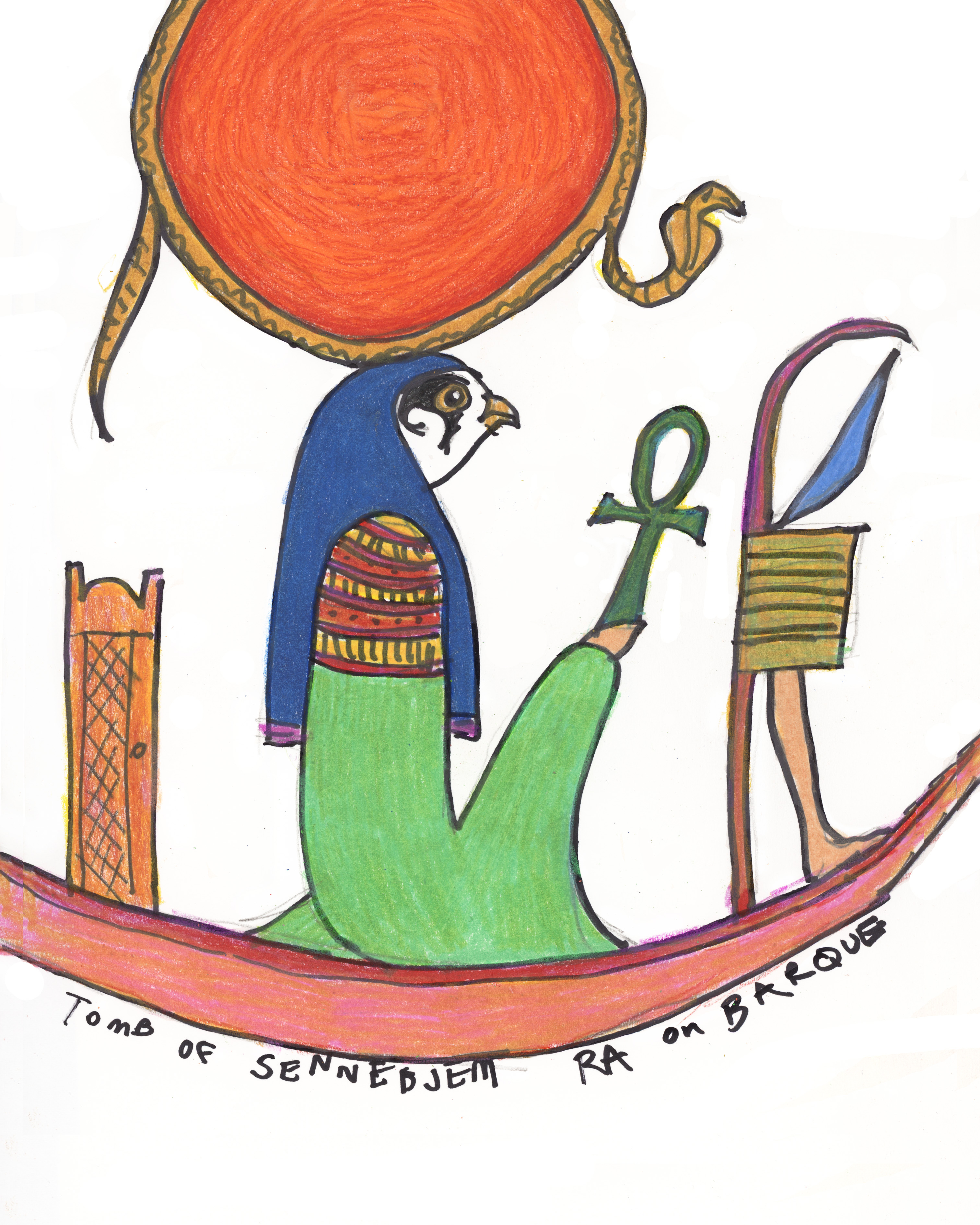![]() Joan Ann Lansberry, 2019, Sharpie pen, colored pencil, some digital alteration for the sun disc Sunday, May 12, 2019 I felt quite frustrated last night, wanting to draw, but not knowing what. I browsed several magazines, and didn't find any inspiration. I decided to pick up Reading Egyptian Art, by Richard Wilkinson. I found a grayscale photo of a scene from Sennedjem's tomb that lured me. He was illustrating G36, the swallow. I omitted the swallow to concentrate on Ra. In the photo Ra's sun disc was cropped in half, so blindly, I did the same in my drawing. Later on in the book, he uses the same scene to illustrate T18, the "follower" glyph, which you see at far right here. That photo, although smaller, does include the full sun disc. But too late! I'd already inked. So I made my disc bigger with a bit of digital magic. Looking at the photo in grayscale, I used my own imagination for the colors. I confess I like the green robe better than the red robe he wears when in color on the tomb wall. It feels so good to be drawing again. ...