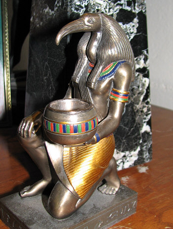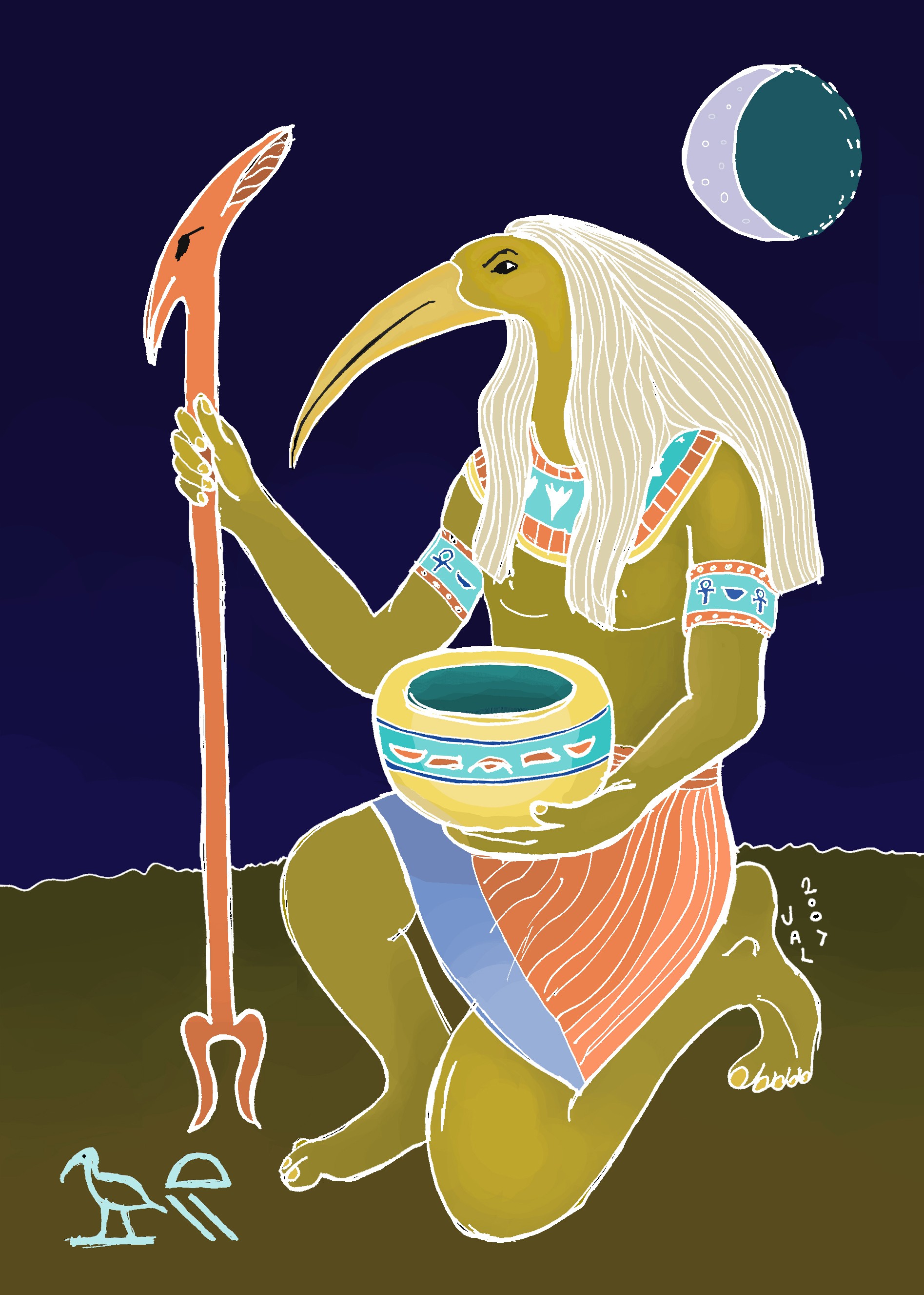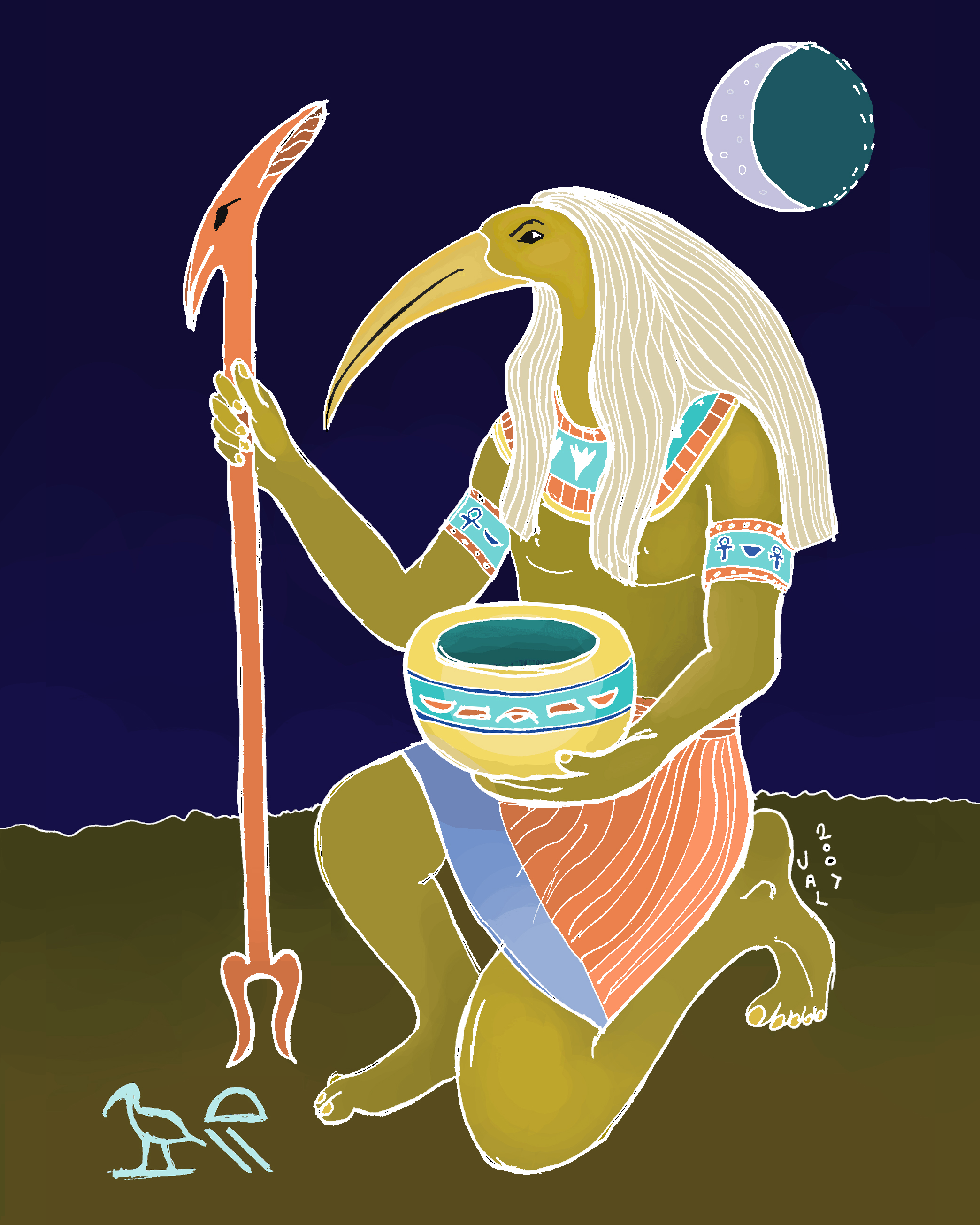 Not satisfied with earlier efforts, I got out the 11in by 14in bristol board and had another try at Thoth. I didn't want to follow the statue exactly, so I gave him something useful to do with the hand that had been resting on his knee! Also, I learned something about the heiroglyph 'neb' which means 'lord of'. The bowl shaped heiroglyph also means 'bowl', so perhaps when Thoth is called 'Lord of Ma'at', they are meaning he CONTAINS Ma'at? So the bowl which I have imagined holds ink for writers and artists, and healing ointment for those who are sick has another meaning. Also, I tried to make the deco on his collar, arm bands and bowl band meaningful, as well as including the heiroglyph for Thoth (Djehuty) in the lower left. In addition, I looked at ibis pictures. The orangish golden beak does exist with the white feathers. Although this is not the coloring of the traditional 'sacred ibis', with its black beak, it is still ibis colors. It made sense then to have the hair white. Also, white hair is often associated with the wisdom that comes with age, and so it makes sense to me that Thoth have white hair. Yes, it's probably not 'Kemetic' standard, but to me it makes sense. As I am trying to impart a sense of 'realism' to the image, and how an ibis head would fit on a human body, golden brown flesh more aesthetically appealing here, this matches better.