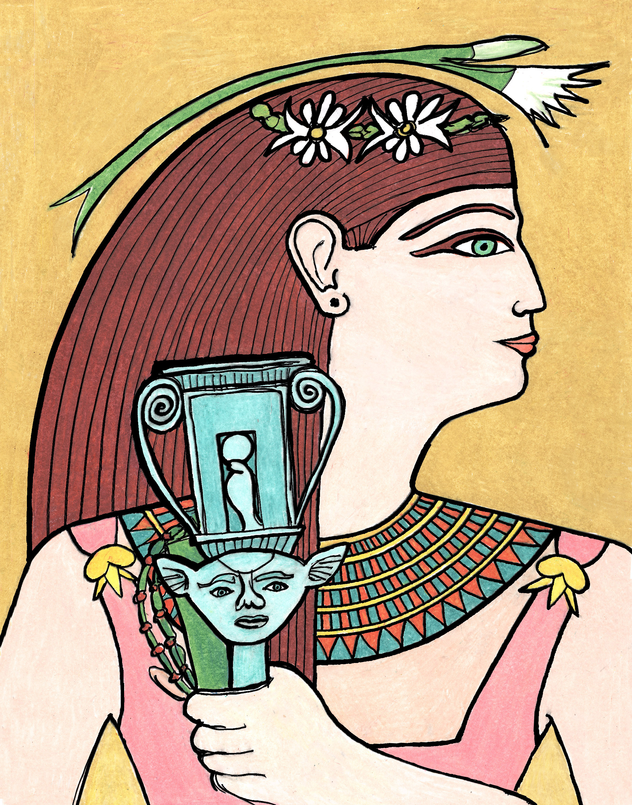 The original sketch took about two hours. Then I was eight hours in fixing my bad sketch. After that, I worked out the color harmonies digitally and consulted that as I colored a print of the corrected version. To keep the linear aspect clear, I copied and pasted the clear black lines from the original corrected line drawing. A few more small adjustments, and I was finally pleased with it!