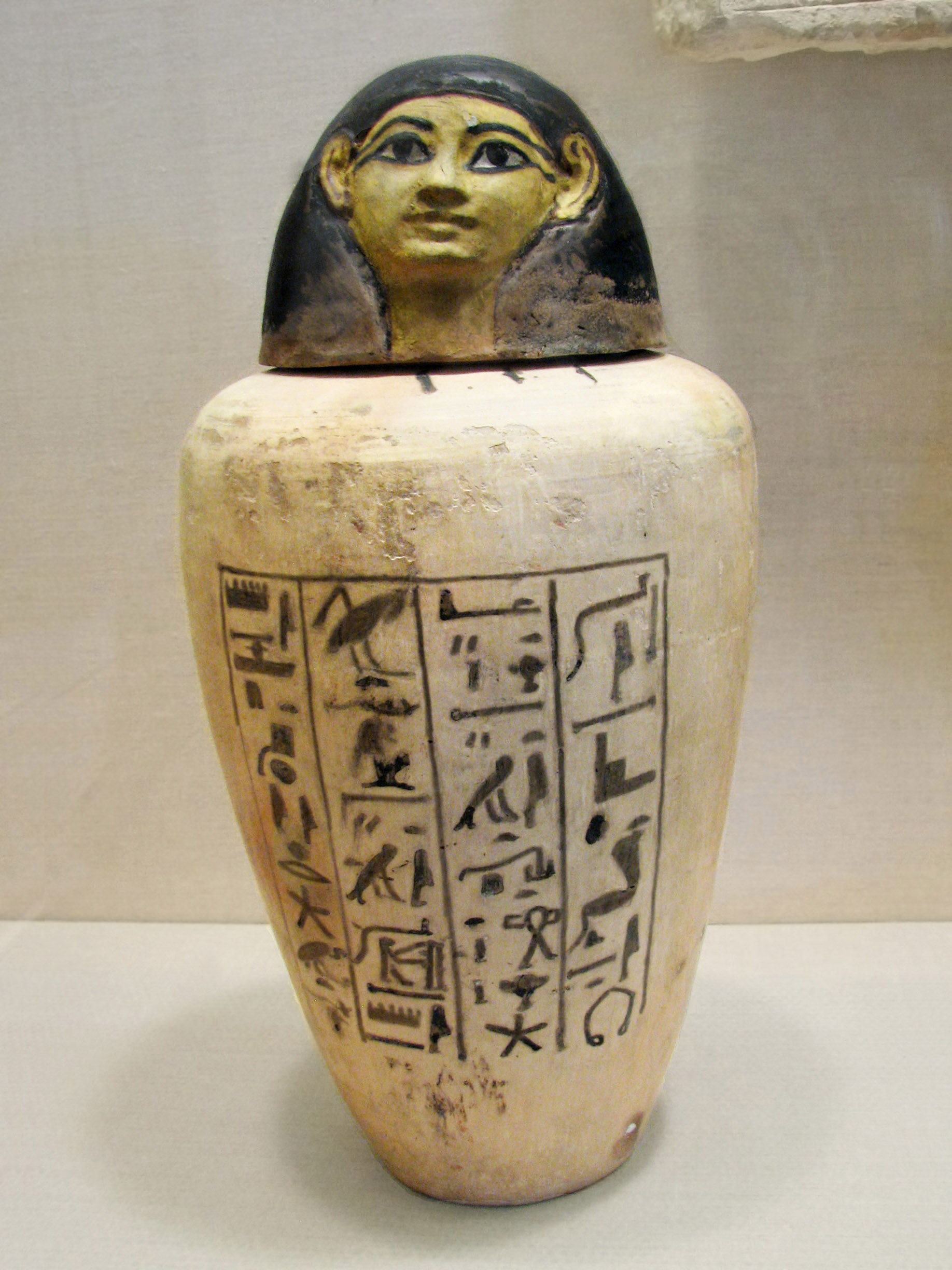 (From info card) "During the mummification process, the liver, lungs, stomach, and intestines were removed from the body, separately mummified, and stored in the tomb in four vessels, called Canopic jars. Each organ was places under the protection of a deity whose head appears on the stopper of each jar." |