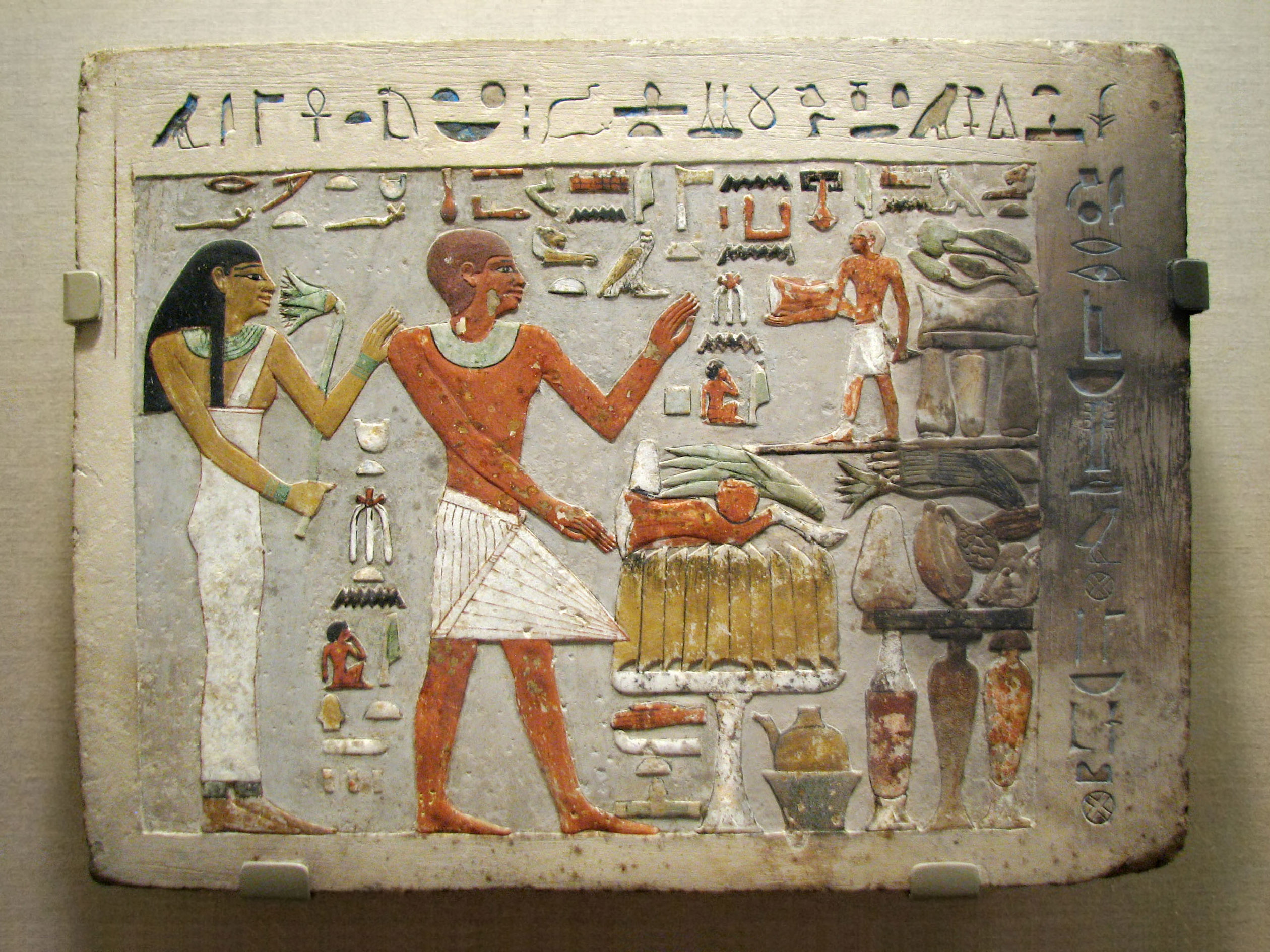 (From info card): "Lauded by Breasted as 'one of the finest pieces I ever saw,' this relief still retains its original, brightly colored four-thousand-year-old pigment. The function of Egyptian tomb art was to preserve scences of daily life for the afterlife. In this scene, Amenemhet and his wife are outfitted with food and drink to sustain them after death. With this piece, Breasted provided the museum with a beautiful and archetypal example of Egyptian funerary art that also depicts the daily lives of ancient Egyptians."