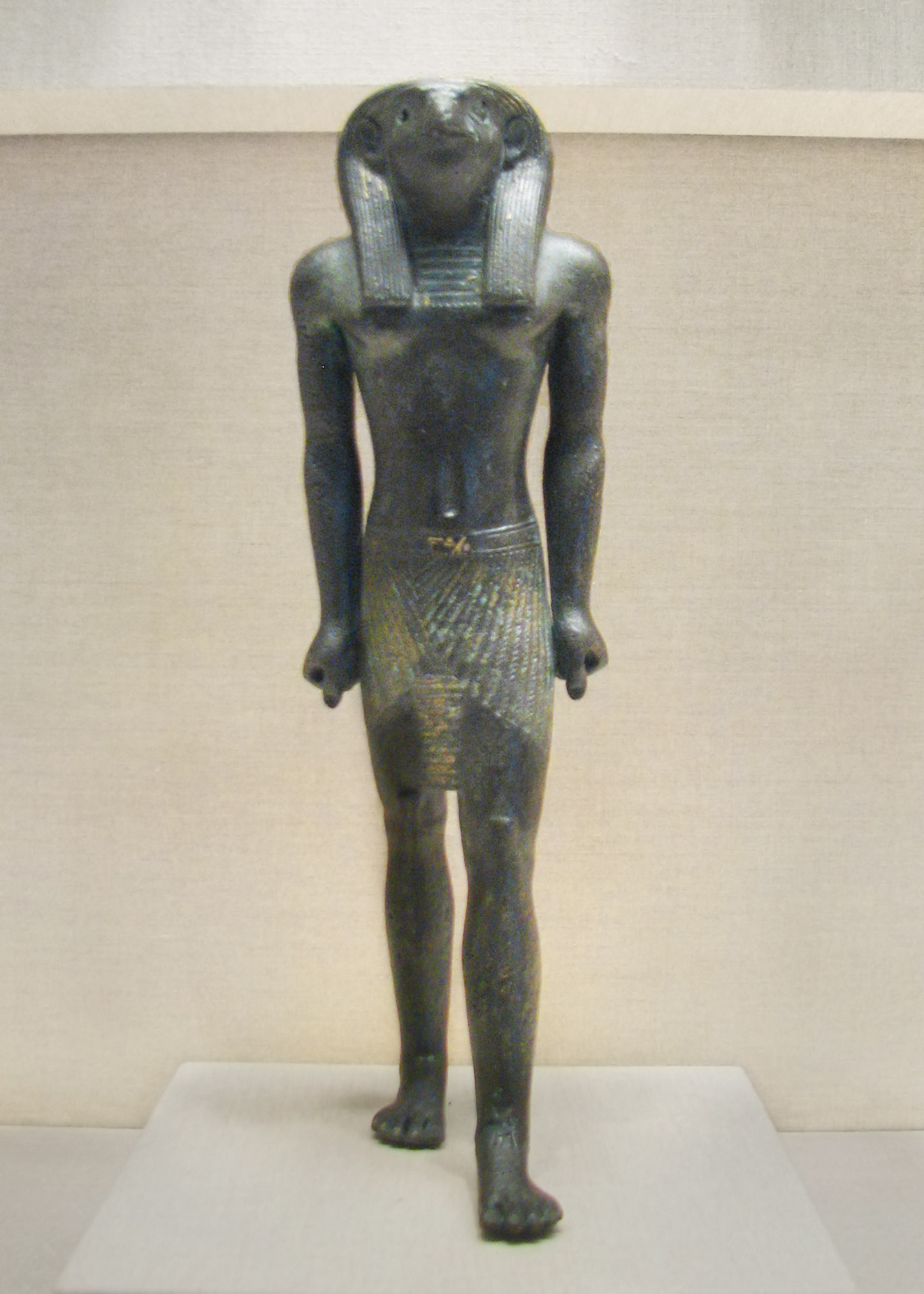(From _The Complete Gods and Goddesses of Ancient Egypt_, by Richard Wilkinson, pages 205-206) "The sun god Re was arguably Egypt's most important deity. Though possibly not as old as the falcon god Horus, Re was an ancient deity who coalesced with many other solar and cosmic gods through time while retaining his own position. At an early date he seems to have merged with the falcon god becoming Re-Horakhty as the morning sun, and with Atum as the evening sun. In the Book of the Dead we actually find Re fused with these and other deities as the composite Re Horakhty-Atum-Horus-Khepri." Notice this statuette shows Ra Horakhty with large human ears! |