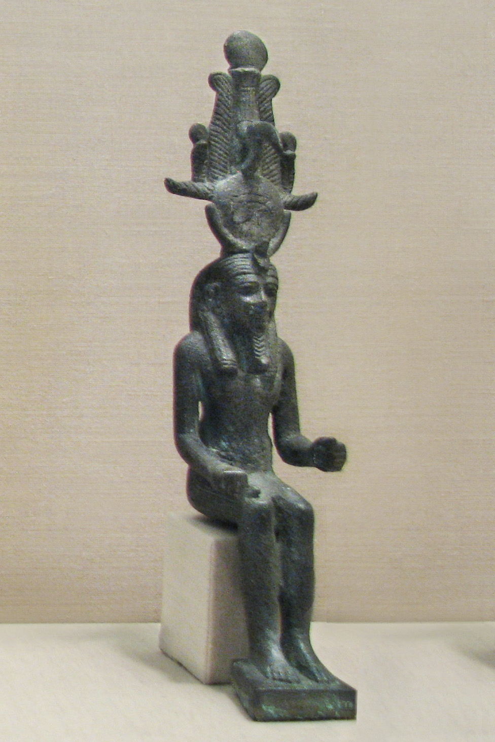"According to the Egyptian religion, gods could combine with each other to form composite deities. The complex crown of this bronze statuette has characteristics of the god Osiris, as well as the ibis-headed moon god Thoth. This statuette was dedicated to the god by a man named Pamu."