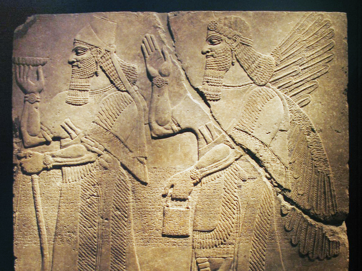 From museum website: "We can distinguish Ashur-nasir-pal II from his protective genies by the king’s unique crown. The basic design is a low tapering cap resembling a modern Turkish fez; it represents the ruler as chief official of the kingdom. The spike projecting from the top symbolizes the king as warrior, and the broad sash wrapped around the crown reflects his elevated status in Assyrian society. Here the king is shown holding a bowl and a hunter’s bow. The bowl was used for offering libations; the bow and bowl together may refer to a hunting ritual. Archaeological excavations throughout the ancient Near East have revealed numerous examples of real bowls of this type in copper, bronze, silver, and gold." My photo above obscures the king somewhat, so I turn to an adaptation of a museum curator photo so we can see his details better: |