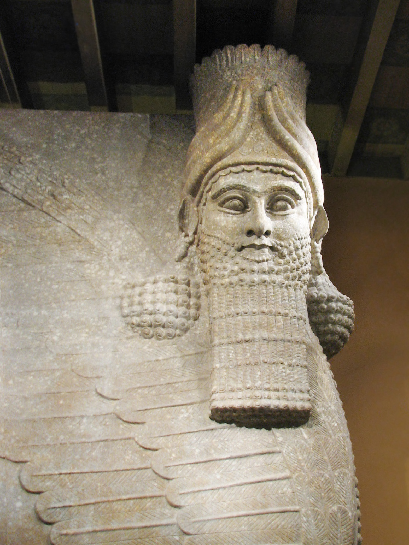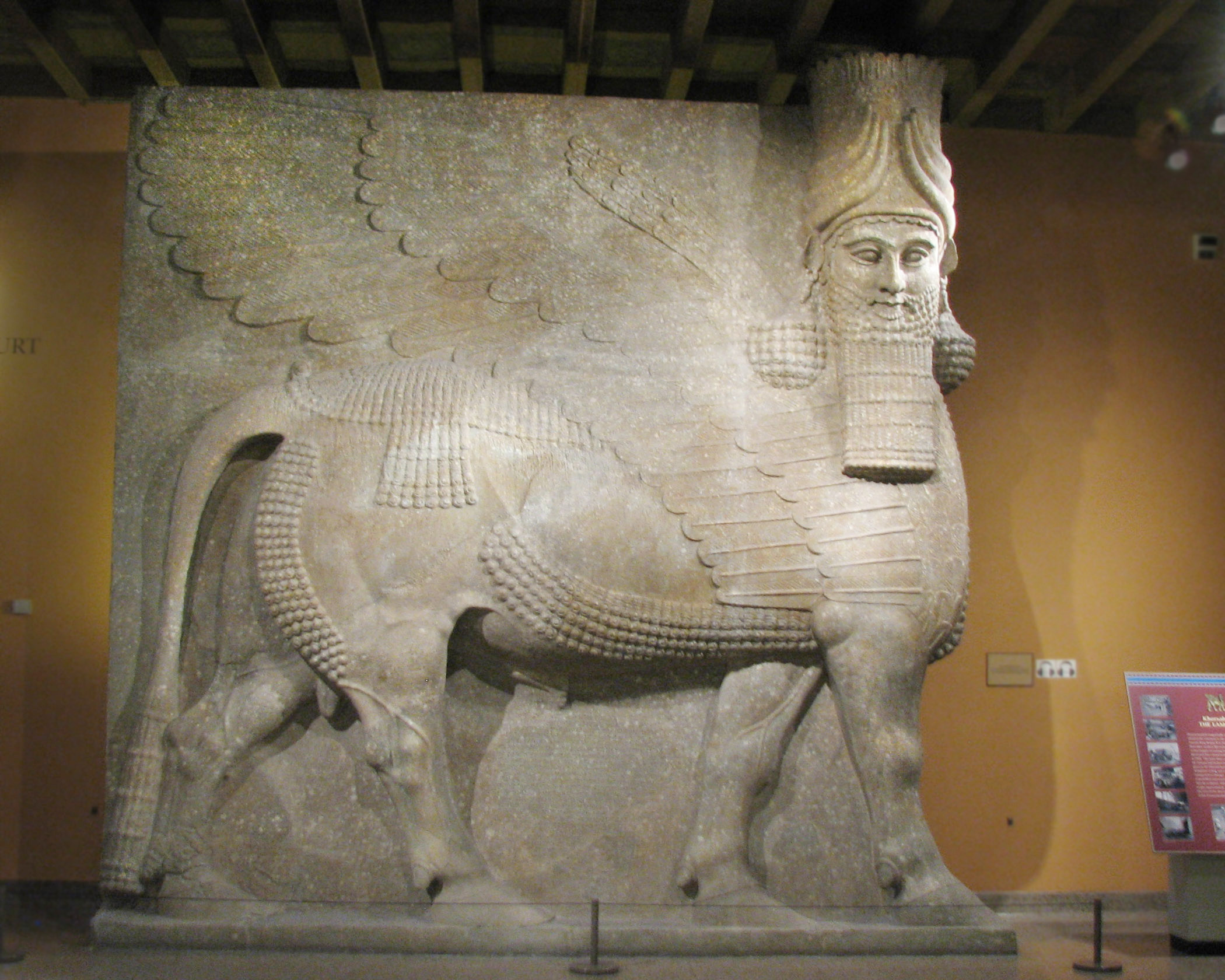"This colossal sculpture was one of a pair that guarded the entrance to the throne room of King Sargon II. A protective spirit known as a "lamassu", it is shown as a composite being with the head of a human, the body and ears of a bull, and the wings of a bird. When viewed from the side, the creature appears to be walking; when viewed from the front, to be standing still. Thus it is actually represented with five, rather than four, legs." |