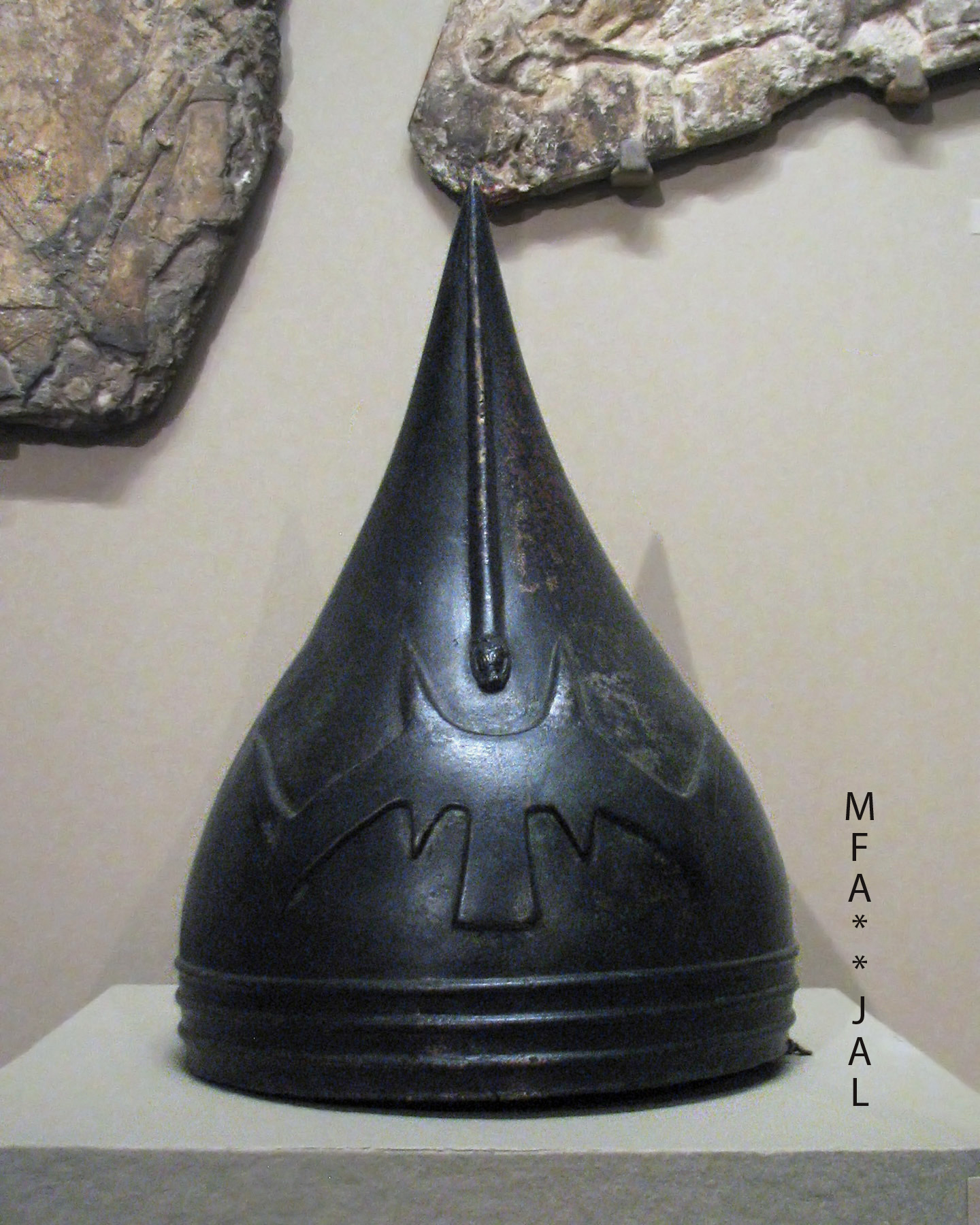 "Helmets of this type were worn by the Assyrians and some of their neighbors from the tenth to the late seventh centuries B.C.E.[...] This helmet bears an insignia peculiar to those excavated at the Urartian citadel at Karmir-Blur, near Yerevan, capital of Armenia.