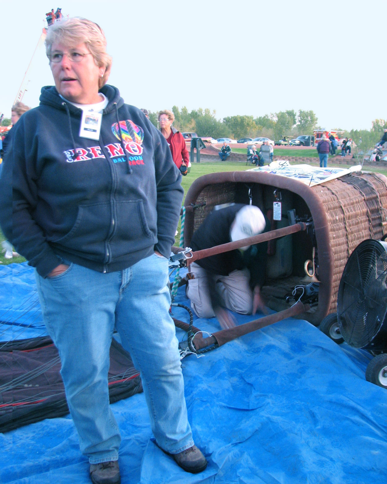 We got there in plenty of time to get good parking, which made for an easier exit. Nothing much happened early, for they were all waiting on the meteorlogical people to give their okay, and to be assigned their turns. Officials watched while perched from a high crane, to better supervise. You can see part of that crane behind the lady's head in the first photo. We were really lucky to be there, for she explained much about the basics of ballooning. A teacher by profession, her ease with presentation and subject were a delight. Just earlier, Nick had wondered out loud, why the wicker baskets, isn't that 'old fashioned'? No, the wicker is superior, because with the lightness, it has flexibility to absorb the shock of a harder landing. But hard landings don't happen unless the winds are strong.