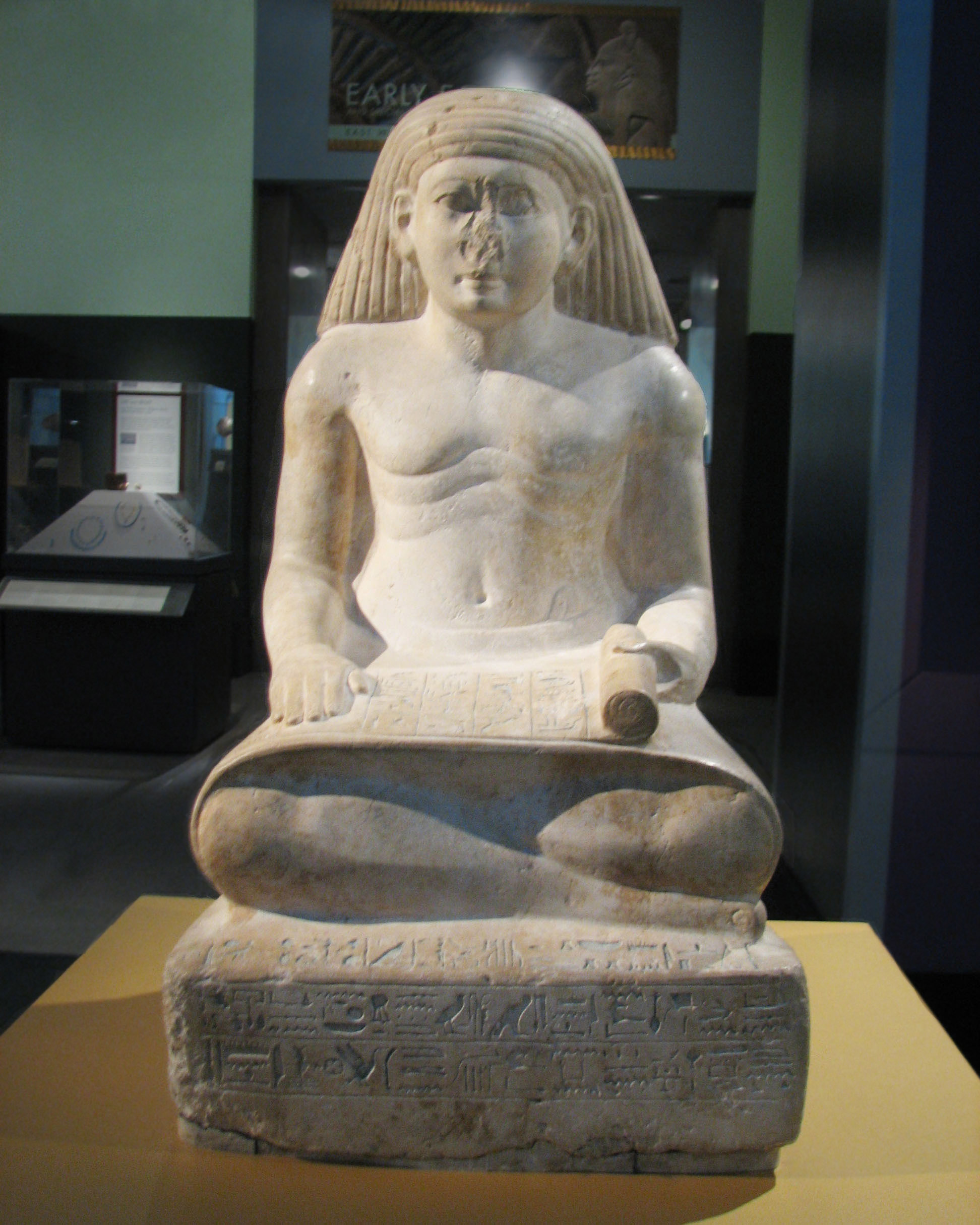 The Museum website has the info: "The Egyptians valued learning and literacy above all other skills, including physical strength and military prowess. Egyptian men who mastered reading and writing were frequently represented as scribes, sitting cross legged with inscribed papyrus rolls in their laps. Some examples, such as this one, show the subject with his head gently inclined as if reading the papyrus. "So-called scribe statues were first produced in Dynasty 4 (circa 2625–2500 B.C.). Originally only princes were permitted to appear in this form, but as access to schooling increased over time, scribe statues became relatively common. The subject of this sculpture, a man named Amunhotep, held several priestly and administrative offices." |