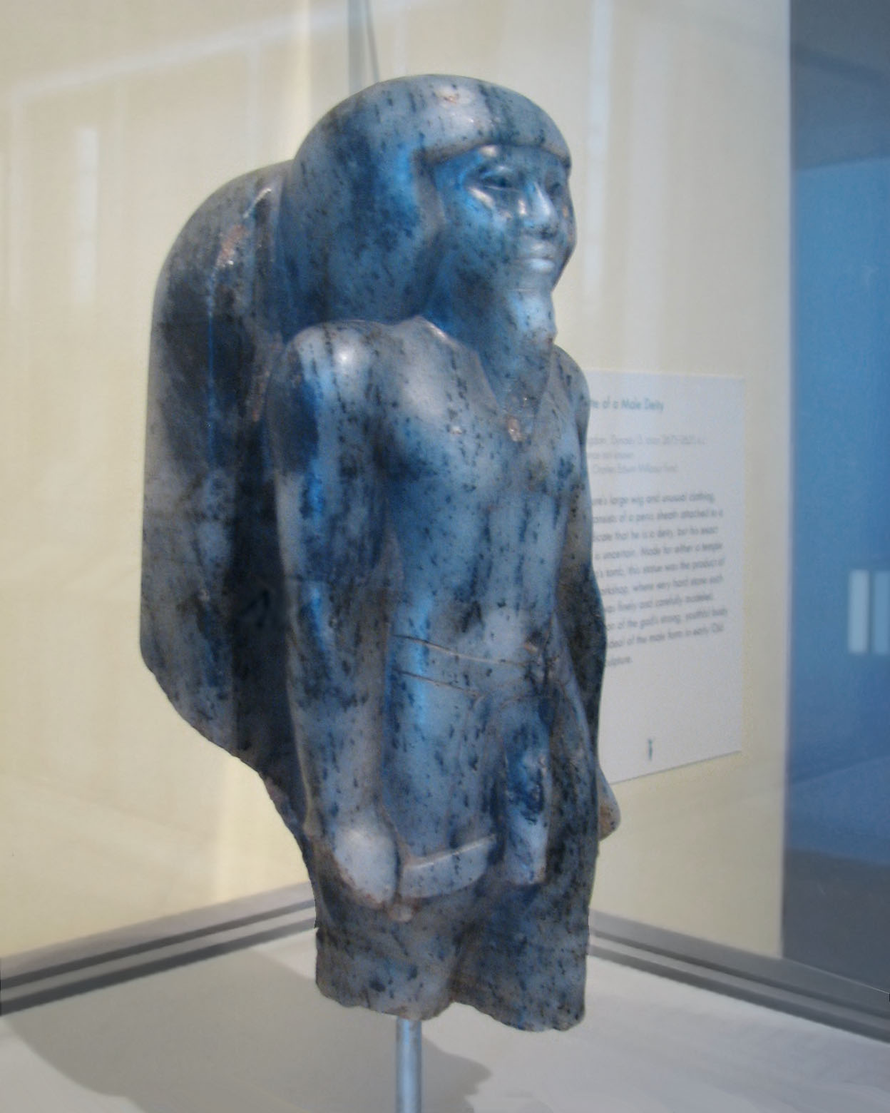 (From the info card) "The figure's large wig and unusual clothing, which consists of a penis sheath attached to a belt, indicate that he is a deity, but his exact identity is uncertain. Made for either a temple or a king's tomb, this statue was the product of a royal workshop, where very hard stone such as gneiss was finely and carefully modeled. This depiction of the god's strong, youthful body reflects the ideal of the male form in early Old Kingdom sculpture."