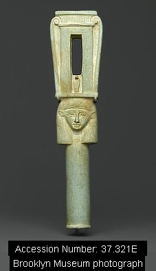'I have opened your temple. "When the king enters her temple with her musical instruments, so he brings with him the power to control the turbulent divinities residing there." _Hathor Rising_, page 57 The Brooklyn Museum has a sistrum fragment, of which I only caught a small portion, as an incidental to some other items I was photographing: