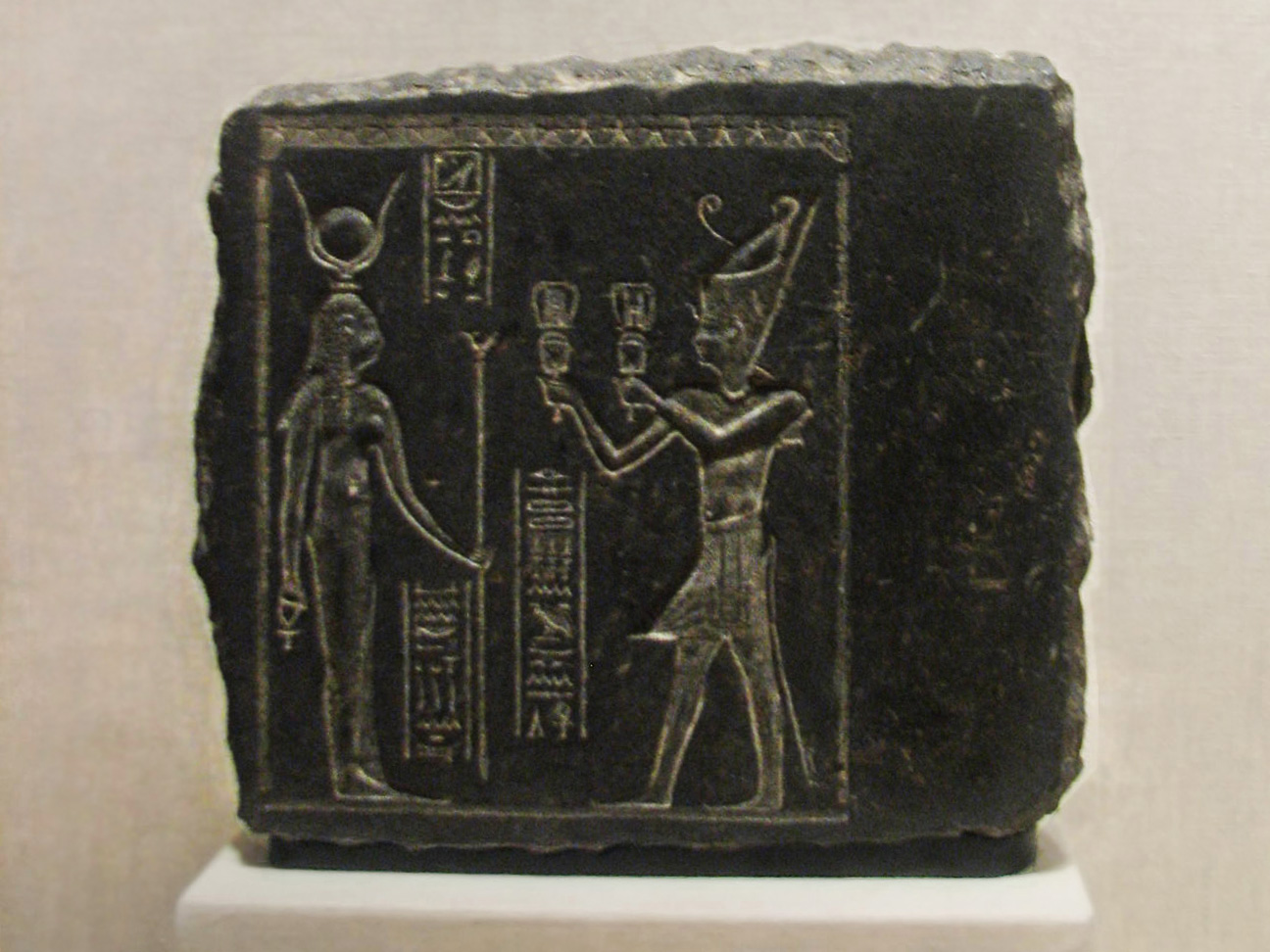 (From the info card): "Music could appease deities, including goddesses. Here, in a setting of the world bounded by hieroglyphs for earth and heaven, a king as dutiful son stands with sistra before one form of "his mother," the goddess Hathor. As is characteristic of Egyptian goddesses, she holds a papyrus scepter, a symbol of vigor and renewal, and grants the king the "lifetime of Re" and "the years of Atum," meaning eternal life." Alison Roberts explains, "...playing a sistrum in the temple cult was a highly skilled accomplishment and specific rhythms had to be learnt by the temple musicians, who were often female. But the king was also trained in the art, and is shown in the temple of Edfu shaking sistra and running before Hathor, greeting her with the words: