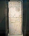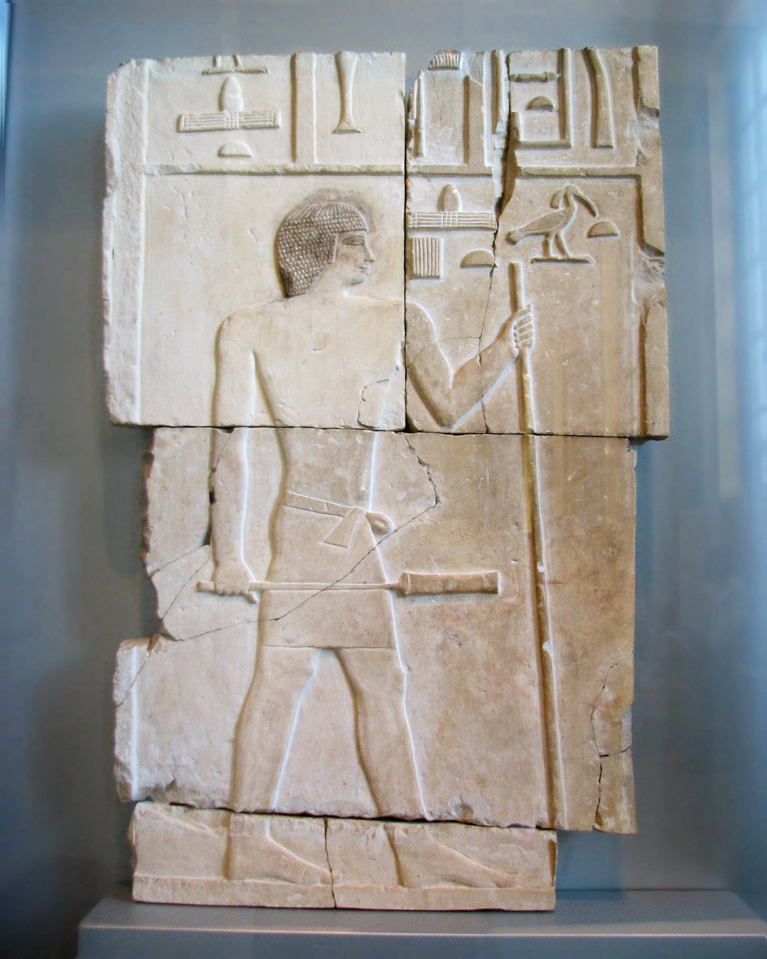 (from the info card) "This relief depicts Akhty-hotep, an Old Kingdom official, in a simple wrapped kilt and a short, curly wig. The tall walking stick and paddlelike baton indicate his official status. Akhty-hotep's name appears in hieroglyphs in front of his face and also, partially preserved, above him to the left. Egyptians believed that, in addition to tomb statues, images like this one could house the dead owner's spirit. The high, bold carving typifies relief of the early Old Kingdom." Notice the scepter (aka 'paddlelike baton') Akhtihotep has: