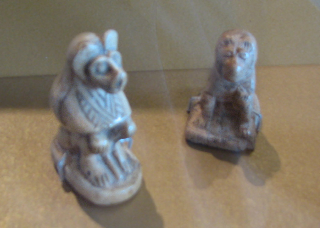 (From info card:) "With the exception of wealthy nobles, most Egyptians had only a few valuable possessions that they hoped to take with them to the afterlife or leave to their children. They kept these treasured belongings well organized and secure by storing them in small boxes, often tied with a string. Boxes such as this example might have held a variety of objects, such as cosmetics, jewelry, or a child's lock of hair." There are two baboons decorating its outside, which may have had more than mere decorative properties. Baboons show up in other forms, such as these two tiny gaming pieces: |