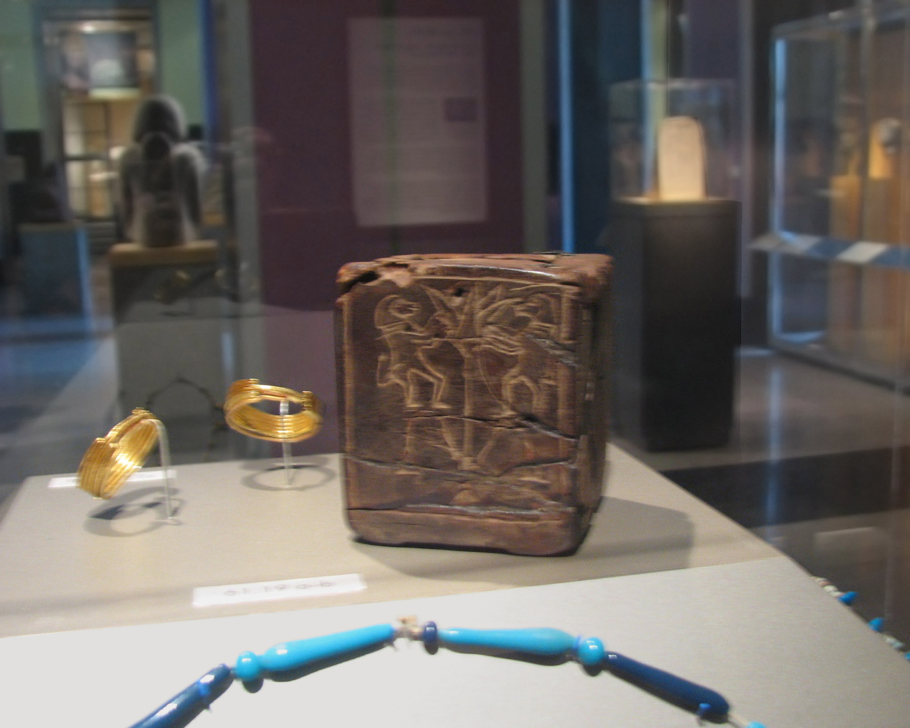 (From info card:) "Many small ivory and faience baboons have been found in Middle Kingdom tombs. Some scholars believe they functioned as gaming pieces. Others argue that because images of baboons often appear on other protective objects—such as the "magic knife" nearby—the figures served as eternal guardians of the deceased." Unfortunately, I don't have a photo of the 'magic knife'. |