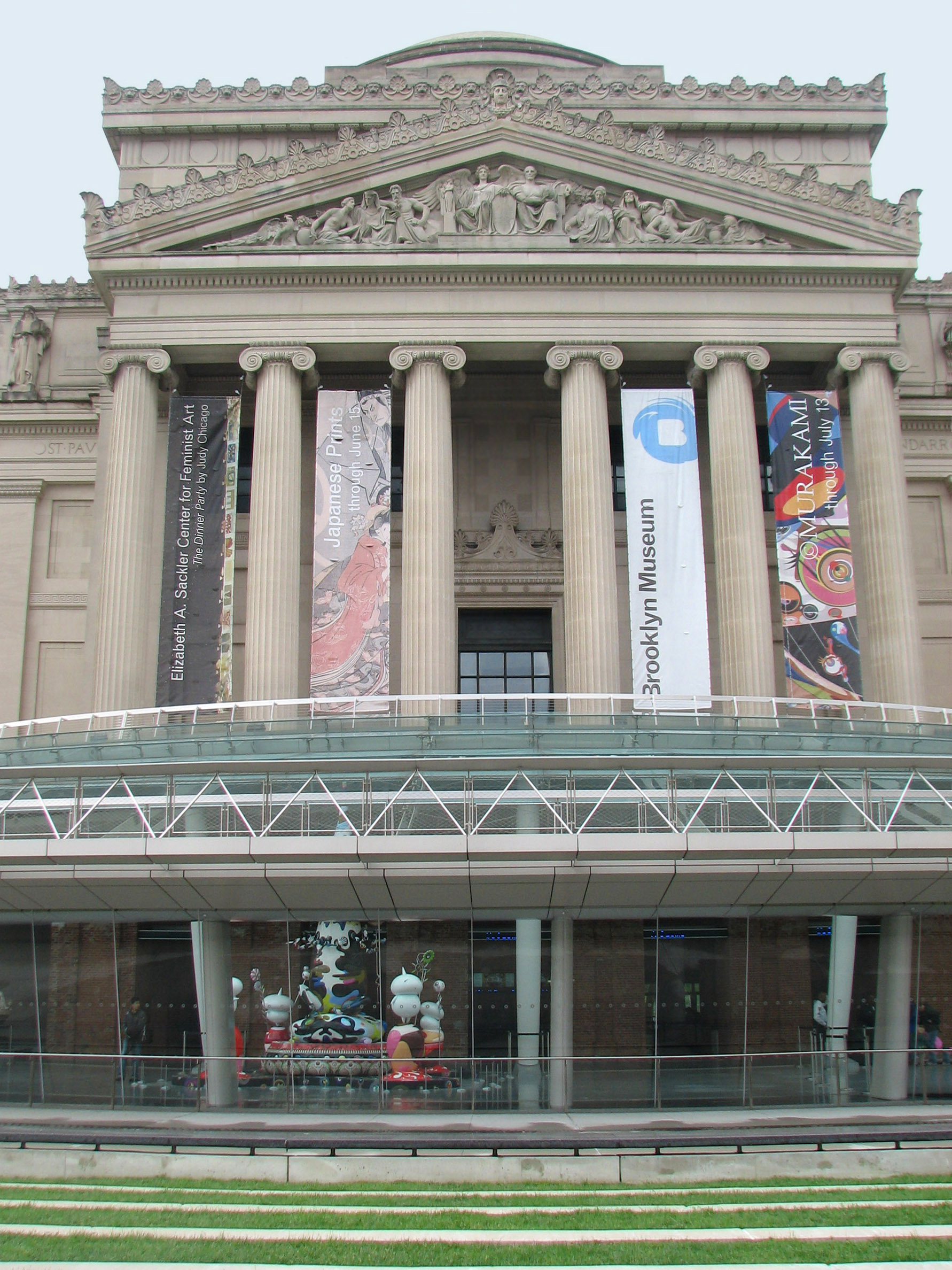 "The magnificent Beaux Arts building that houses the Brooklyn Museum was designed by McKim, Mead and White in 1893." It originally had a huge staircase leading up to the columns. But that staircase was difficult to climb and "by the mid-thirties" it was regarded as an obstacle, so it was removed. The glass entrance pavilion and lobby were installed in 2004. It echoes the old staircase while providing a light and airy introduction to the museum. (Info in quotes from _Brooklyn Museum: Building for the Future_, a booklet I got as a souvenir which shows all the stages of the museum building's evolution. Also, you can see part of one of the Murakami sculptures through the glass window. The rest of his fun and fanciful exhibit could not be photographed. |