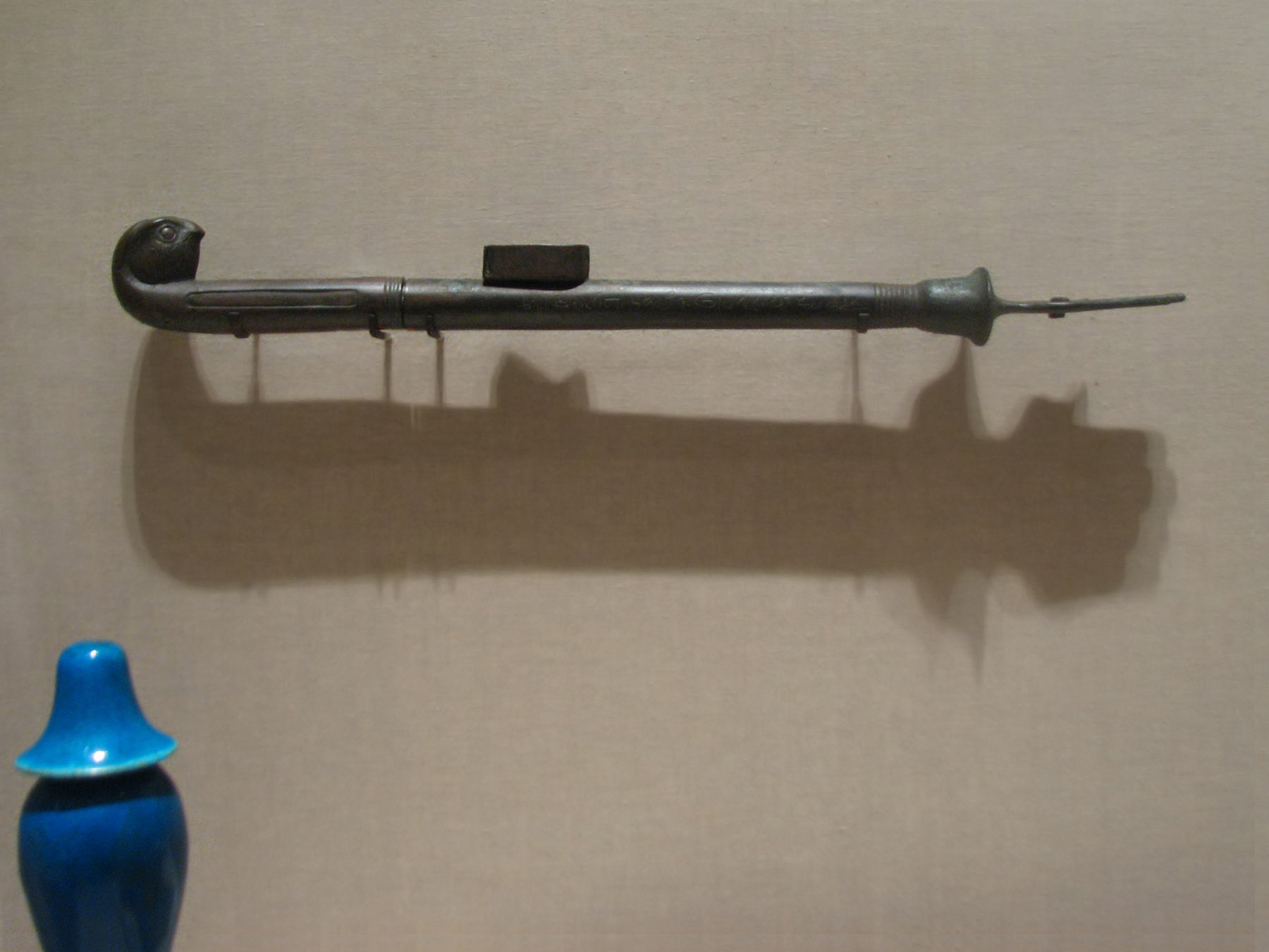 | The instrument Seti I is using appears very similar to the one now in the Brooklyn Museum. (I include the museum's photo so you can better see the Horus falcon head:) |