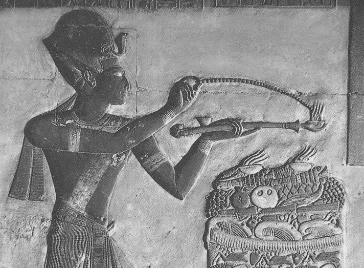 "Another use of the offering arm is found in the design of censers which were frequently made in this same form. The objects consisted of a handle - usually about the length of the human forearm - with a hand at one end which held a bowl in which incense was burned. A small box was often attached to the upper surface of the 'arm' to hold the pellets of incense burned in the bowl. Various elaborations were made upon this basic design, and here, as is frequently the case in other examples, the 'elbow' of the censer has been shaped as the head of a falcon-like deity and the 'wrist' area is expanded into a decorative papyrus umbel - both elements symbolic of solar and offering concepts."(Ibid) He gives a image of Seti I censing at his temple in Abydos: |