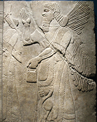 "The Genie in this panel has an eagle head. "Ancient Assyrians believed that eagle-headed beings with human bodies, called apkallu, were endowed by the gods with extraordinary wisdom. Apkallu were thought to have helped build the great cities, and it was believed that they ensured the well-being of the cities' inhabitants. Small, clay eagle-headed figurines have been discovered buried in the walls of Assyrian building, probably to protect against evil." We'll see falcon headed beings in the Egyptian collection, also! |