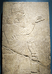 "The twelve massive carved alabaster panels that line the walls of this gallery are but a small sample of the hundreds of such reliefs, all originally brightly painted, that once adorned the vast palace of Ashur-nasir-pal II, one of the greatest kings of ancient Assyria. Completed in 879 B.C at the site of Kalhu (modern Nimrud) in what is now Iraq, slightly north of Baghdad, the palace was the heart of a vast empire. "Like modern billboards trumpeting the virtues of some authoritarian ruler, the reliefs in Ashur-nasir-pal II's palace served a propagandistic purpose, proclaiming the king's legitimacy. Because most people in the ancient Near East understood the administration of the state as a collaborative effort between the king and the gods, many of the reliefs show the ruler and his supernatural attendants celebrating religious rituals. The most common depict the ruler and his winged protectors (genies) tending a sacred tree, an ancient symbol associated with the divine power to bestow life. Other reliefs from the palace show Ashur-nasir-pal II engaged in such princely pursuits as warfare, hunting, or celebrating his victoires at elaborate banquets." (From the info cards)
