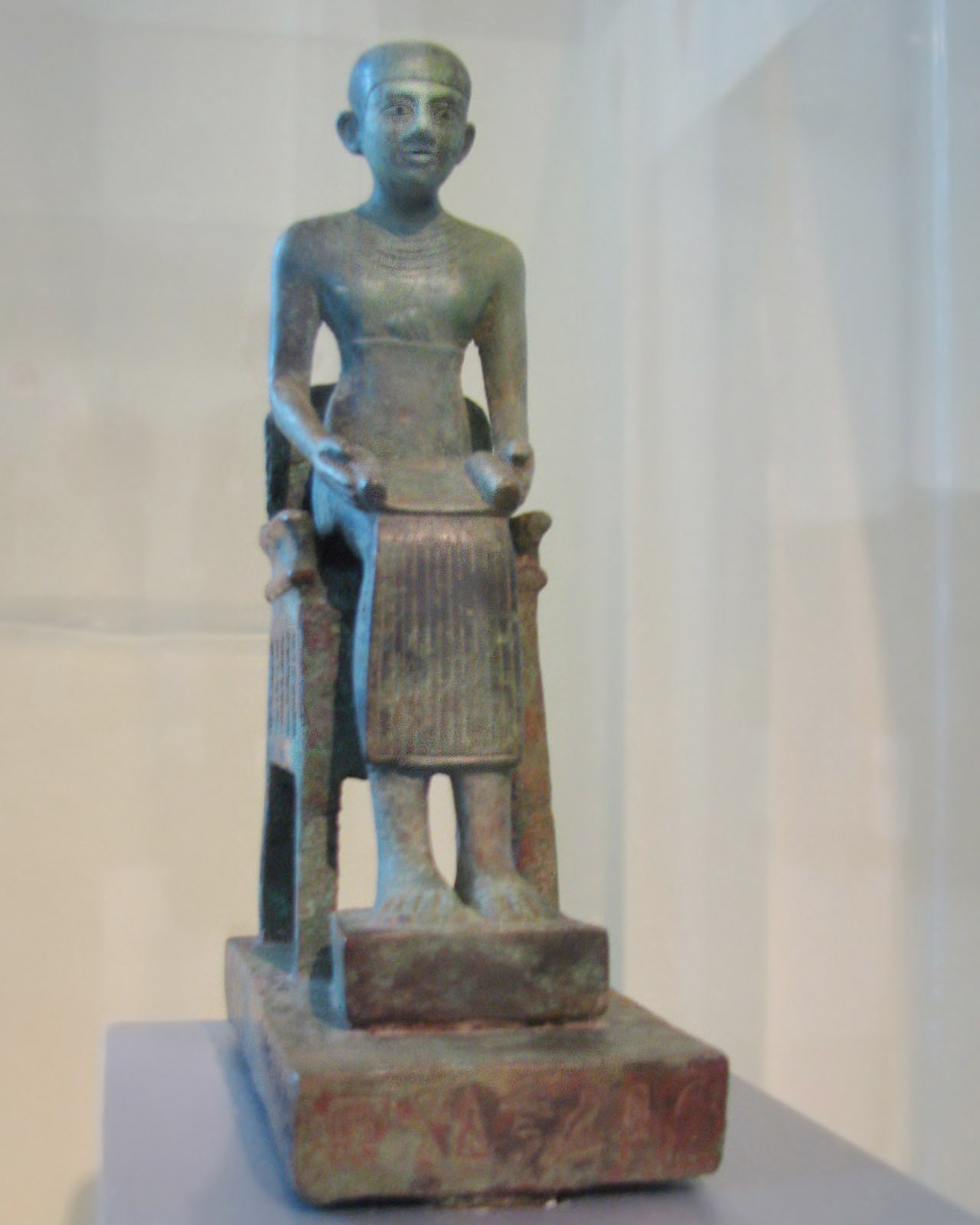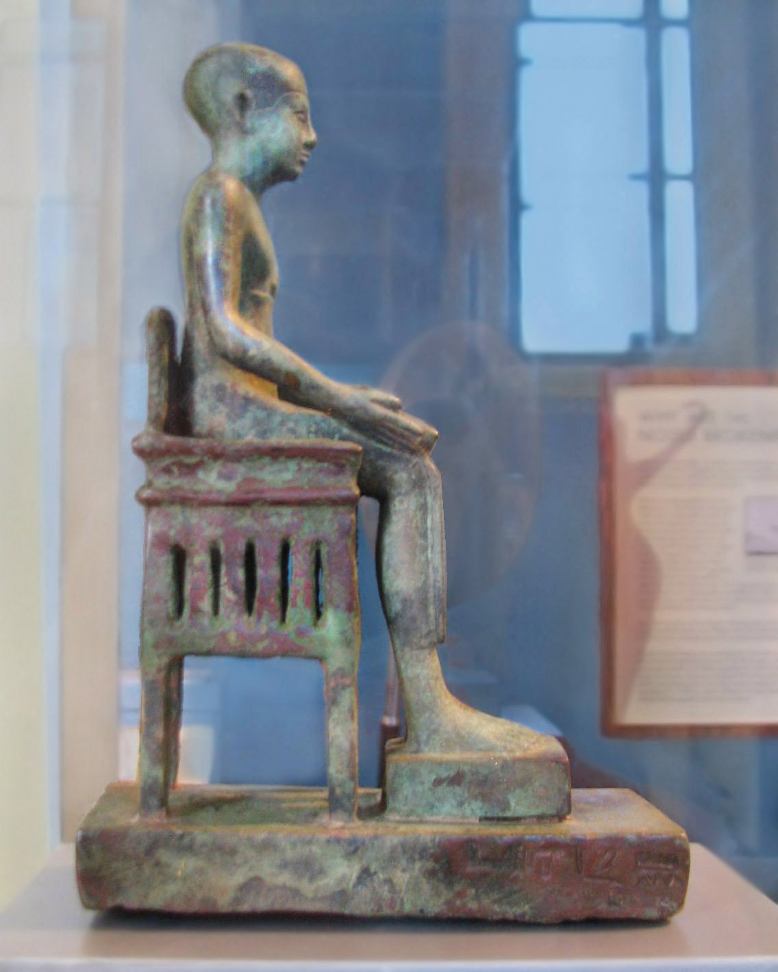 (From the info card) "Imhotep, an official of King Djoser in Dynasty 3, supervised the construction of the earliest known monumental stone structure, the Step Pyramid. "Over many centuries, ancient Egyptian reverence for Imhotep's wisdom grew until, by the Late Period, he was worshiped as a god. Images of the divine Imhotep show him dressed as an official. This statuette, from more than two thousand years after Imhotep's time, depicts him seated and holding a papyrus scroll." |
