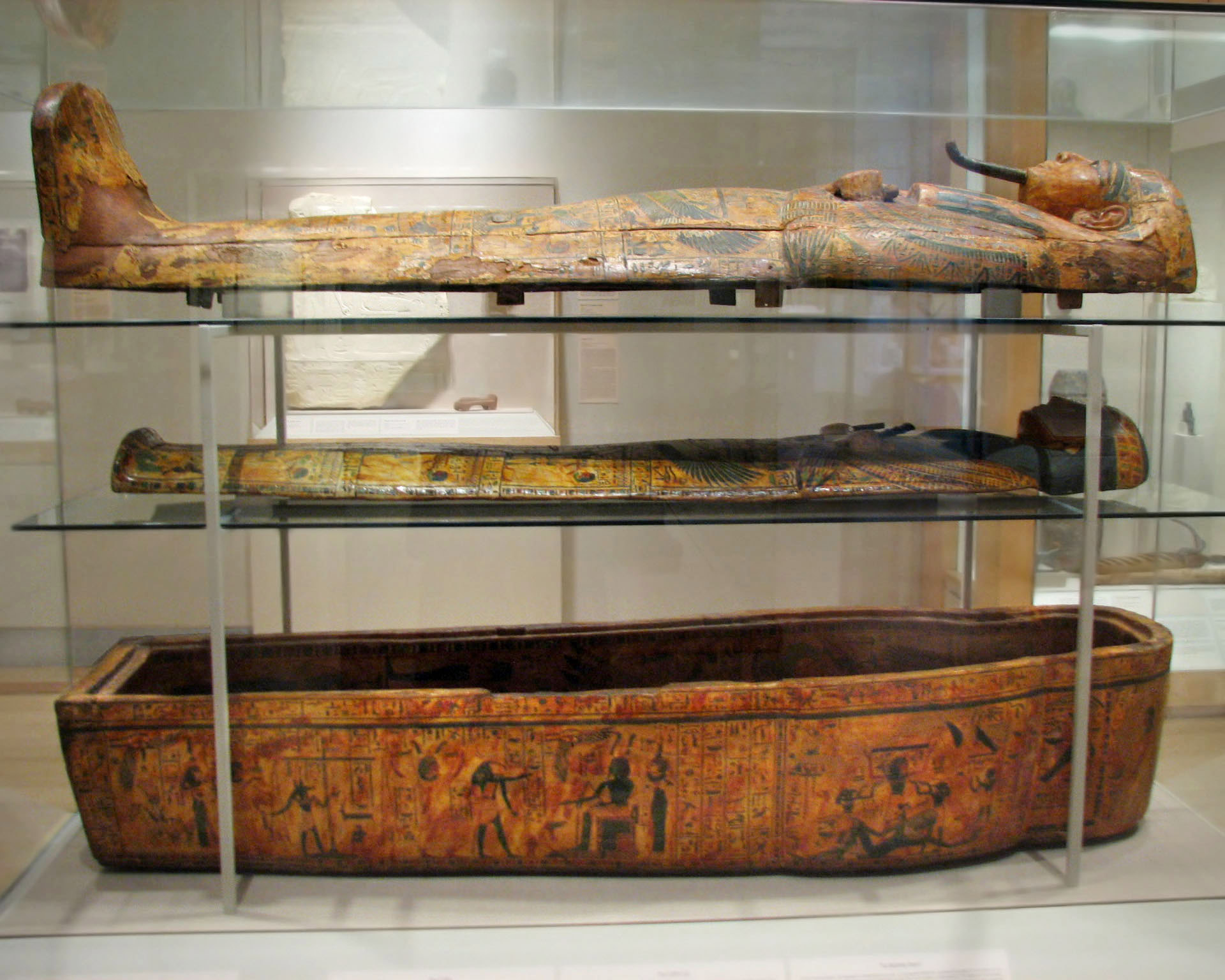 "The decoration on this side of the coffin depicts the successful transition of the deceased to the next world. In the first scene, on the far left, the goddess of the west leads him before Anubis for the ceremony of the weighing of his heart, a ritual that forms part of his judgment. In the next scene, having passed this test (as the four Ma 'at feathers on his head affirm), he is presented to Osiris by the god Thoth. The subsequent scene, the god Shu separating heaven from earth, conveys ideas of re-creation and the triumph of Ma'at over chaos, just as does the passing of judgment itself. Finally, in the last scene, the deceased is shown making an offering to an enthroned falcon in a shrine, a solar manifestation of the god Osiris..."