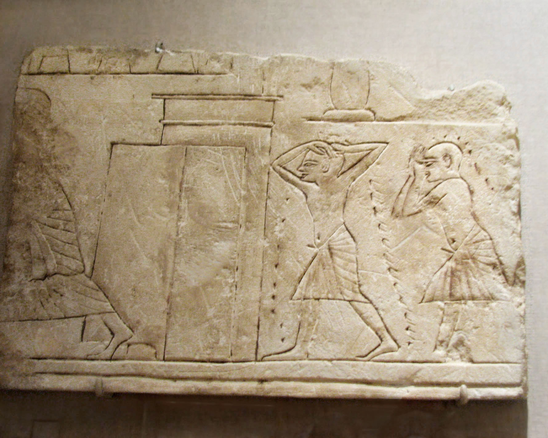 (From museum website): "The controversial reign of the 'heretic' king Akhenaten, known as the Amarna Period, was a time of great experimentation, particularly in the visual arts. Traditional features found in relief, such as register lines and the number of figures included in a scene, were modified to allow freer use of the compositional space. "This relief fragment shows two men on the right who, by their gestures, can be identified as mourners. The small cuts in the stone surface above and in front of the figures quite likely represent the dust that mourning Egyptians are known to have poured on their heads as a sign of bereavement. To the left can be seen the traces of a man in official dress who appears to be hurrying from the opened door of the tomb. The scene speaks strongly of disorganization and chaos, conveying quite clearly the distress that the ancient Egyptians felt in the presence of death." If this has been influenced by Akhenaten in stylistic manner, perhaps it has been influenced by him in other ways: "I refer to two religious ideas absolutely crucial for the Egyptians and conspicious by their complete absence from Akheneten's hymn, having fallen foul of Amarna's censorship: (regenerative) immortality and justice." _The Mind of Egypt_, by Jan Assmann, page 221 Perhaps people had become cynical because of a plague during Akhenaten's father's reign. Arielle P. Kozloff raises the question: "The eight-year gap in an otherwise verbose royal record, the new cults, marriages and art styles, the changes in habitation and in burial practices in the reign of Amenhotep III are uncharacteristic of a culture and king that loved stability and tradition above all else. They are typical of a reaction to a plague." _Bubonic Plague During the Reign of Amenhotep III?_, KMT Journal, Volume 12, No. 3 (Fall 2006), page 46 He commissioned more than 700 huge statues of Sekhmet, a goddess whose roles include protection from plague. Such a huge number strongly suggests he hoped to gain her assistence. (The Brooklyn museum has one, while the Metropolitan museum has several more.) Kozloff gives other clues to this probable event. While in Akhenaten's time, hope of immortality was given up, there is still more contrast. For previously, "Firm belief in immortality made it impossible to include songs expressive of pain and sadness, songs that would have immortalized the negative side of death and the realm of death. In the immediate wake of the Amarna Period, however, this taboo was lifted, and the texts sound an entirely new note expressive of pain and sadness. In them, we encounter the image of death as reversal. Thus, from the reign of Aya (ca. 1320 B.C.E.), we have the tomb of a man named Neferhotep (Theban Tomb 49). In it, his widow mourns: