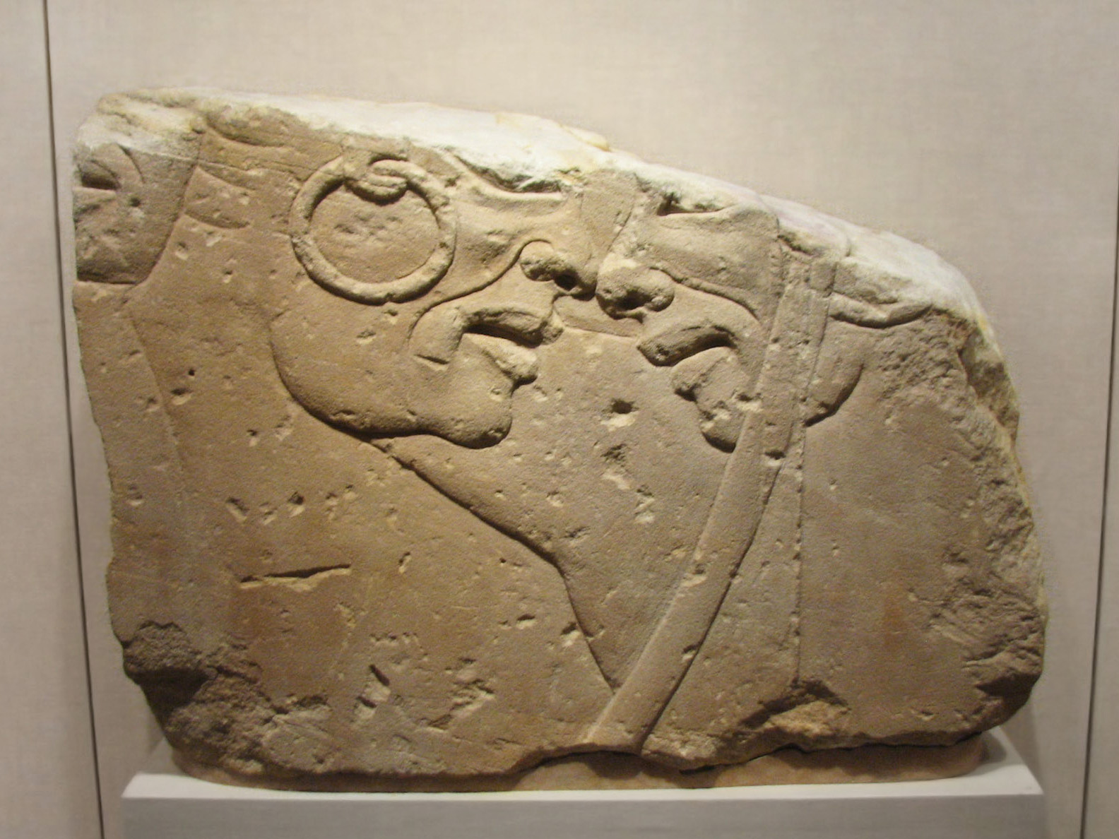 (From the info card) "This fragment of a battle scene shows two Nubian warriors. The man on the right has been wounded in combat. He is supported by a fellow soldier who carries a long Sudanese bow. "Egyptian artisans developed different conventions to depict foreigners. In this example, the hoop earrings and the fleshy folds extending from the nostrils to the corners of the mouth identify these men as Nubians."