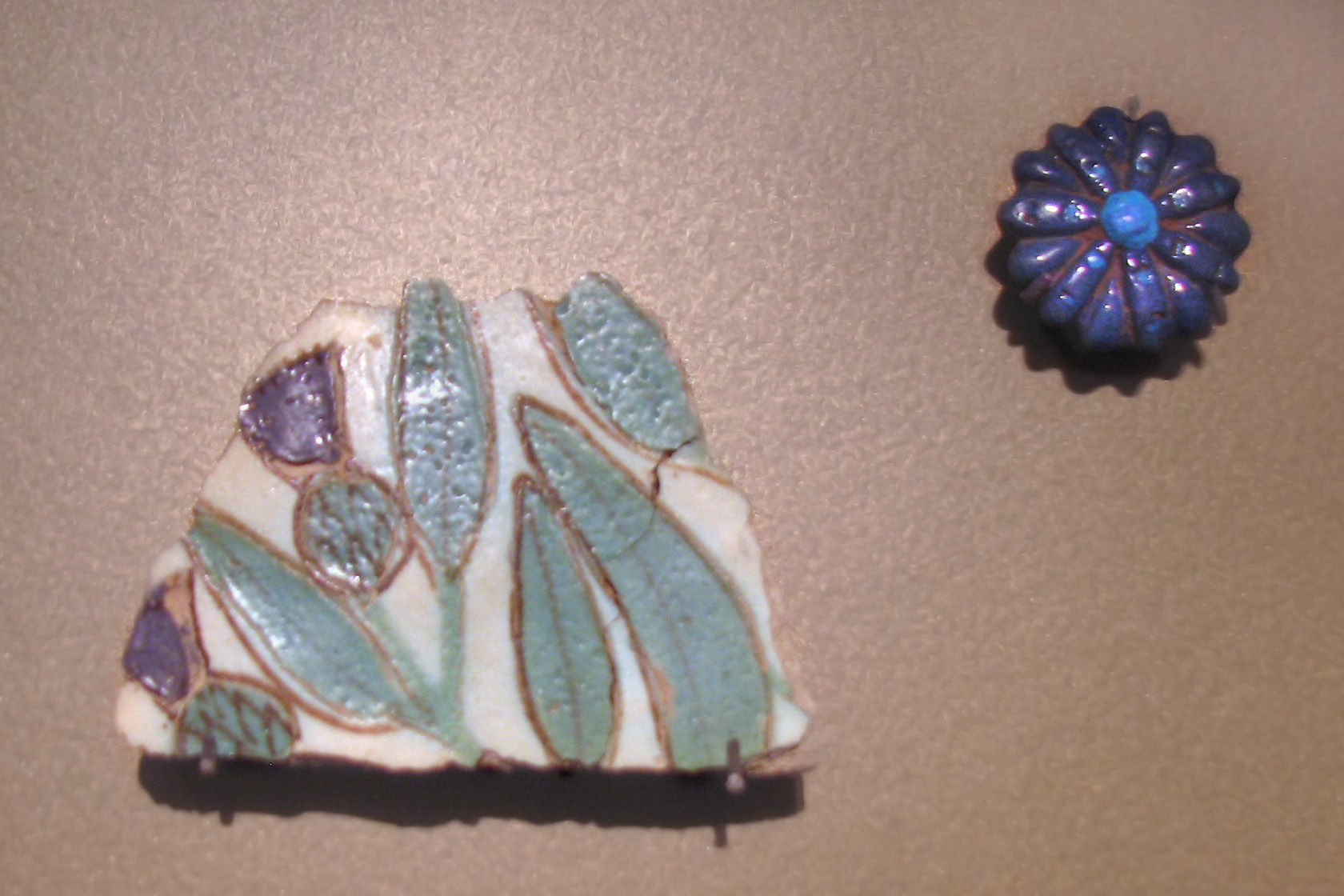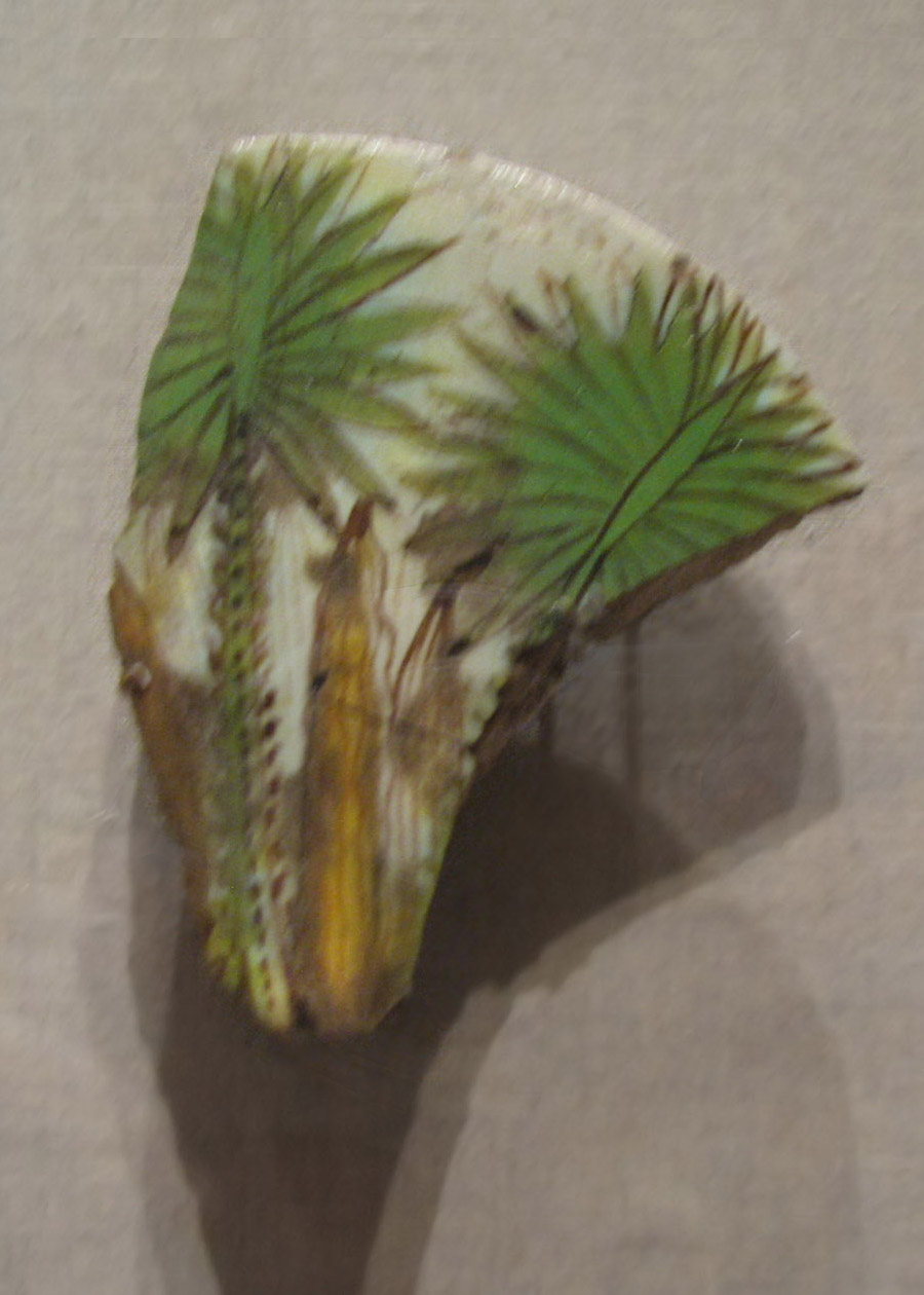 (From the info card) "One of many decorated architectural tiles from el Amarna, this example shows two majestic doum palms and a series of unusual vertical leaves that have not been identified." |