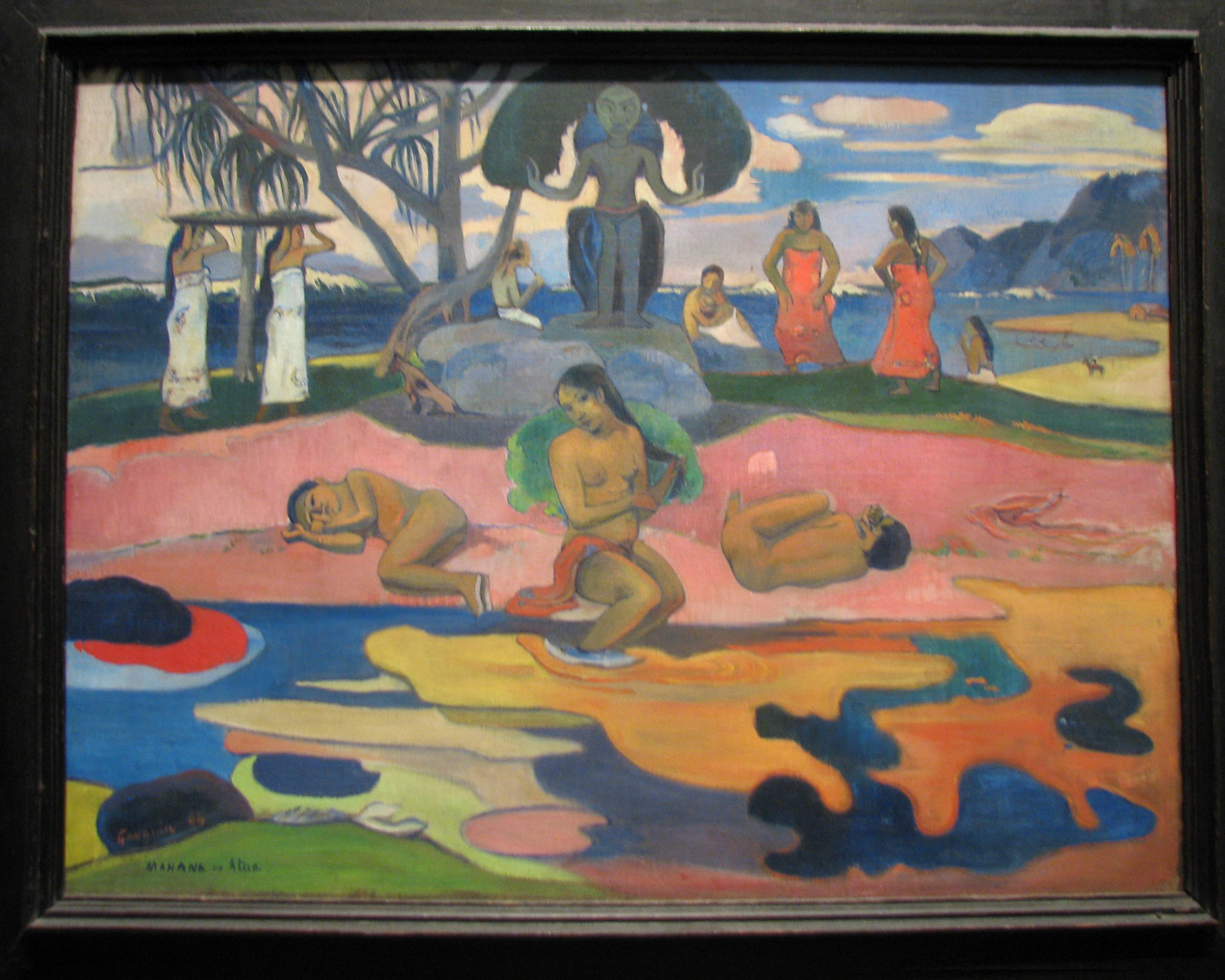 (From Quick Facts) "Gauguin left his home in France to live and work in the Polynesian island of Tahiti in the South Pacific. Although small in size, this painting appears monumental, and recalls great religious frescos. However, this work of memory and imagination was painted on a trip back to Paris. The painting is divided into three zones. A sculpture of a god looms in the background landscape. The three female figures at the edge of the pool are in a middle zone, while the mysterious lower zone represents a sacred pool that reflects 'the essence of form, color.'"