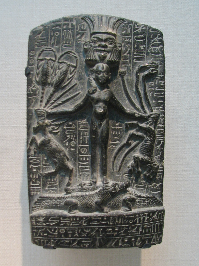 (From Museum website): "The central figure on this stele is the child form of the god Horus. He stands on the heads of two crocodiles, which cross each other beneath his feet and face out to the sides. In his left hand he clutches two serpents and a lion by the tail; in his right, two scorpions by the stingers and an oryx by the horns. Every flat surface on the stele is covered with magical hieroglyphic texts consisting of spells which protect against snakes, scorpions, and the other evil forces the god subdues. "This type of object was often set up in private households, but examples have also been found in tombs, suggesting that their protective powers could also be extended to the deceased." |