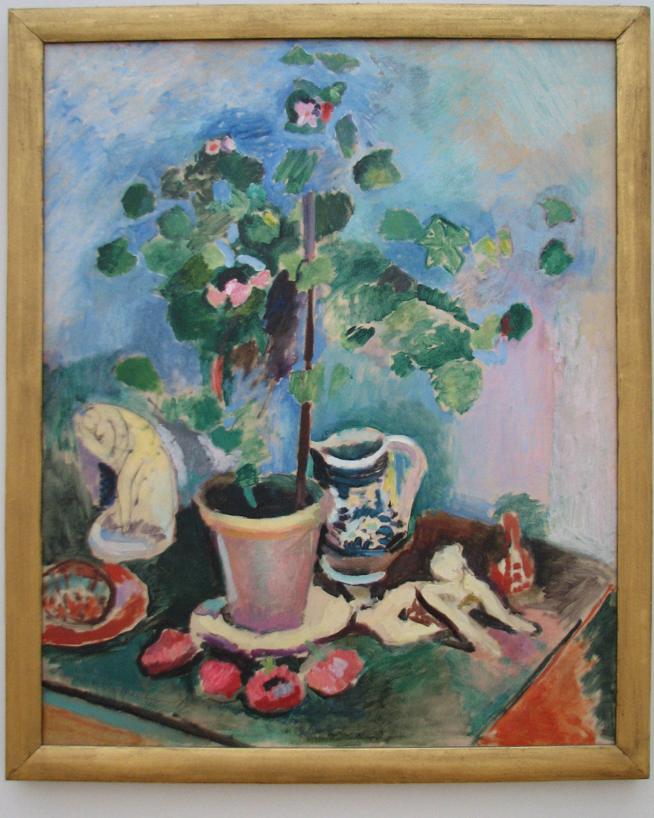 From info card: "This work is one of a number of early still-life paintings in which Henri Matisse incorporated his own figurative sculptures. The Geranium also demonstrates the artist's interest in merging traditional themes with avant-garde practices: he transformed this simple still life into a populated Arcadian landscape painting and rendered this classical subject in the brilliant color, thick paint, and rapid brushwork characteristic of the group of young painters known as the Fauves." |