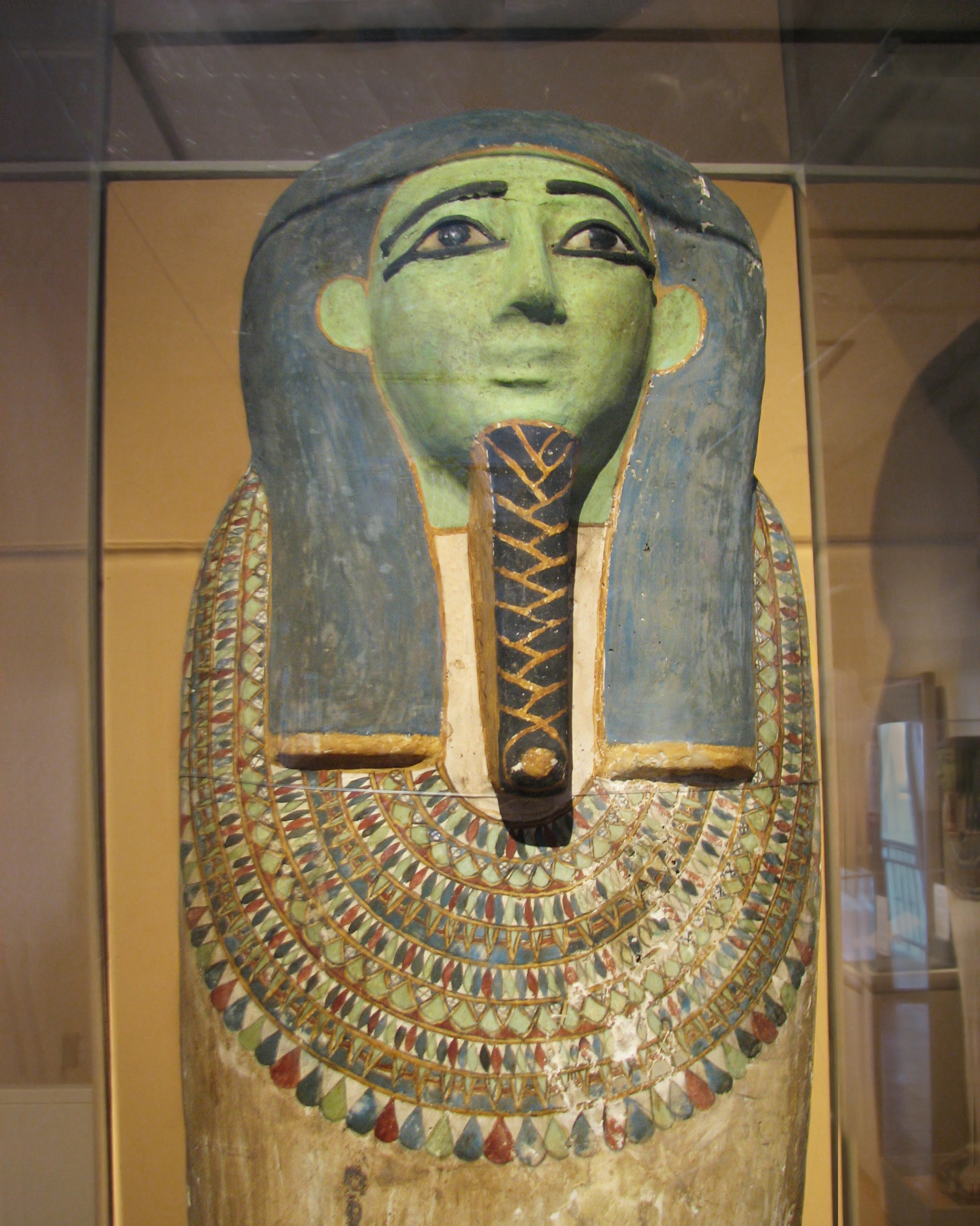 "Despite the popularity of this type of coffin in the Middle Kingdom, c. 2040 to 1782 BCE, this example shows subtle changes in style, reflecting its use at a later time period. The face has been painted green, the color of resurrection, associating it with Osiris, the god of the underworld who had been resurrected by his wife Isis,[Aset]. There is a dark blue wig with yellow borders and a beard attached to the chin and chest over an elaborately beaded collar. Below inlaid bronze eyebrows are the eyes, made from polished limestone with painted irises. The body of the coffin has been painted in an off-white color, perhaps to represent the look of a newly shrouded mummy. Hieroglyphs are painted around the base of the foot box. At the top of the head is a painted Scarab beetle, a symbol of resurrection." |
